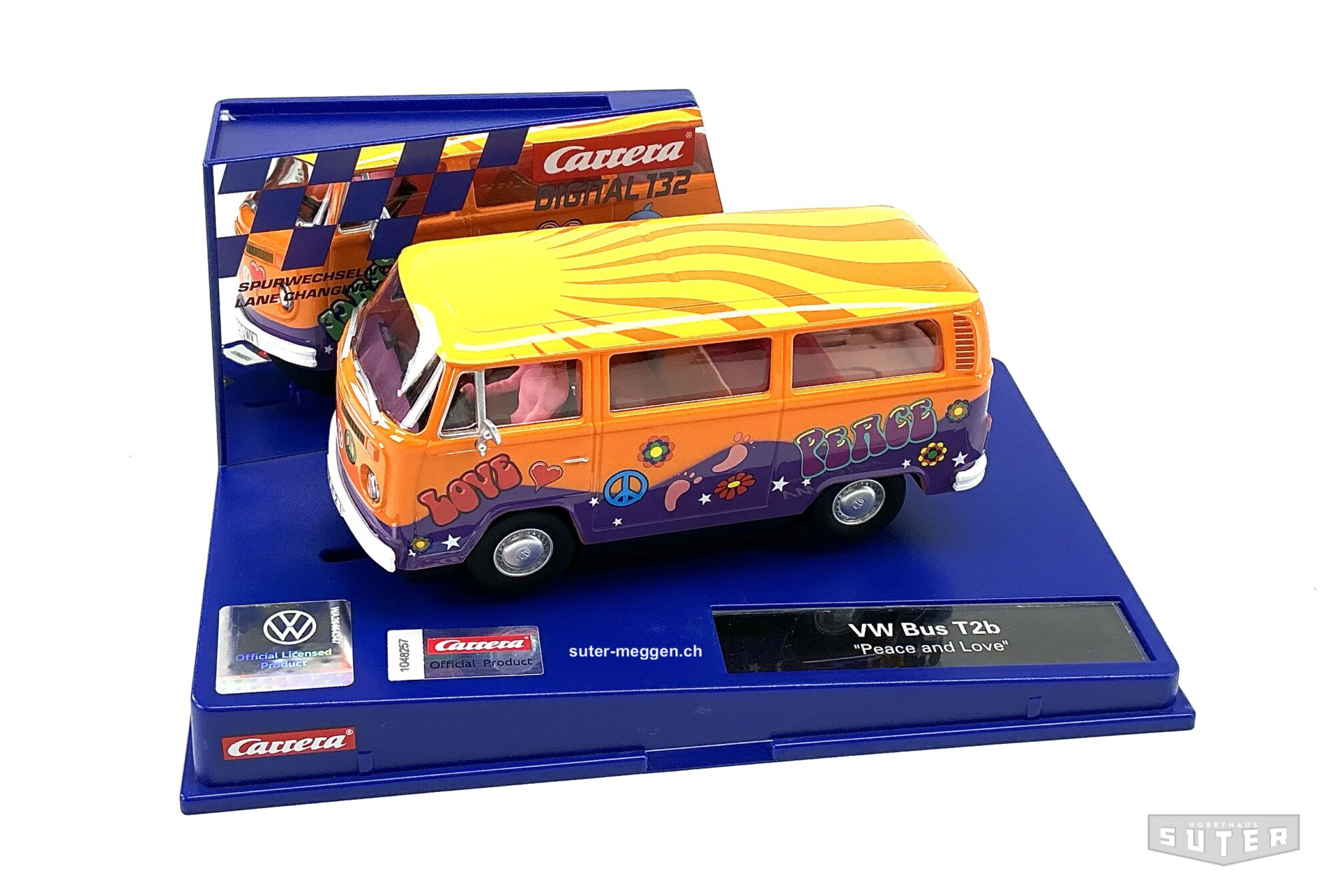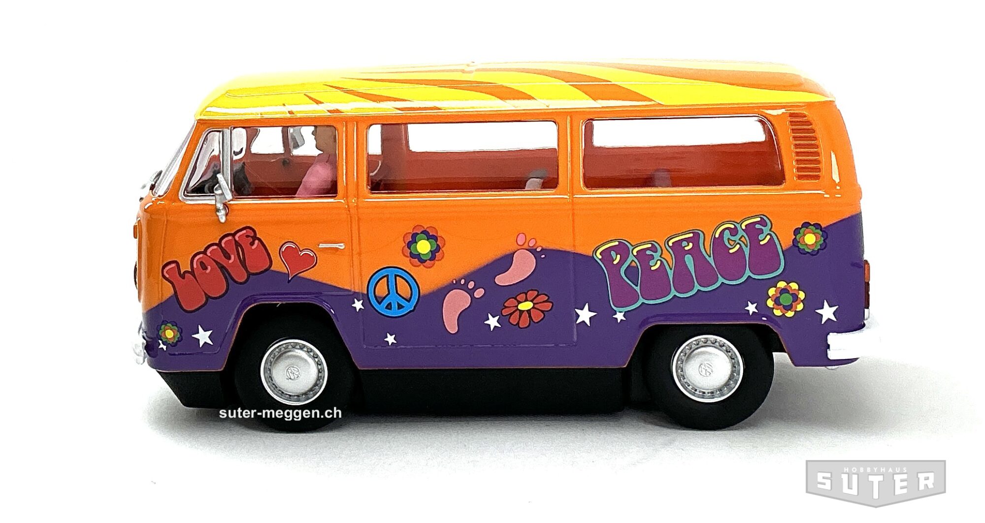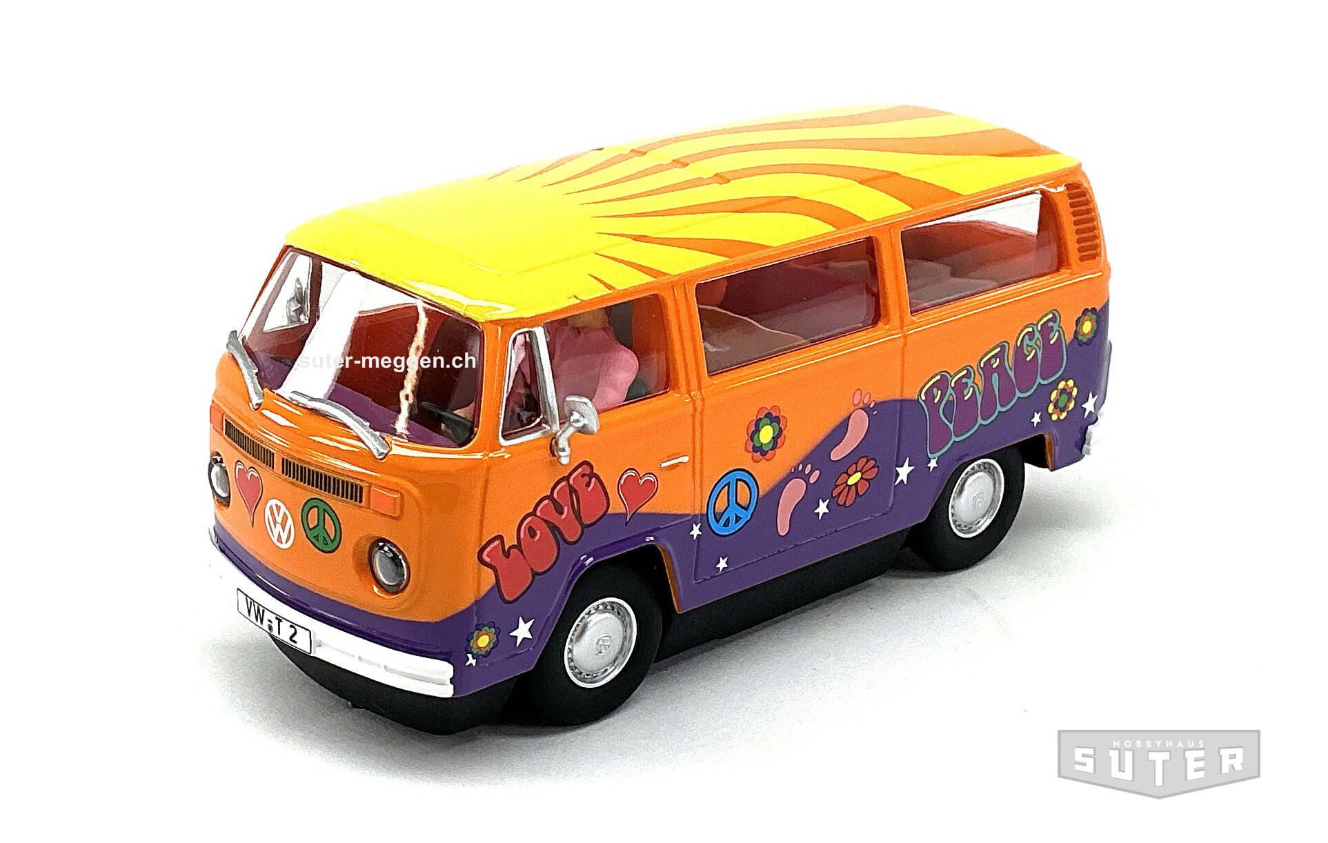 Die bekannten bunten VW Busse der Hippie Bewegung weltweit bereits Kultstatus erreicht. Jetzt gibt es ihn endlich für die heimische Slot-Racing-Bahn, wo er auch Liebe und Frieden verbreitet. Der kultige Bulli-Bus ist mit Blumen und einem großen Peace-Zeichen bemalt, was ihn wie das authentische Kultfahrzeug aussehen lässt.