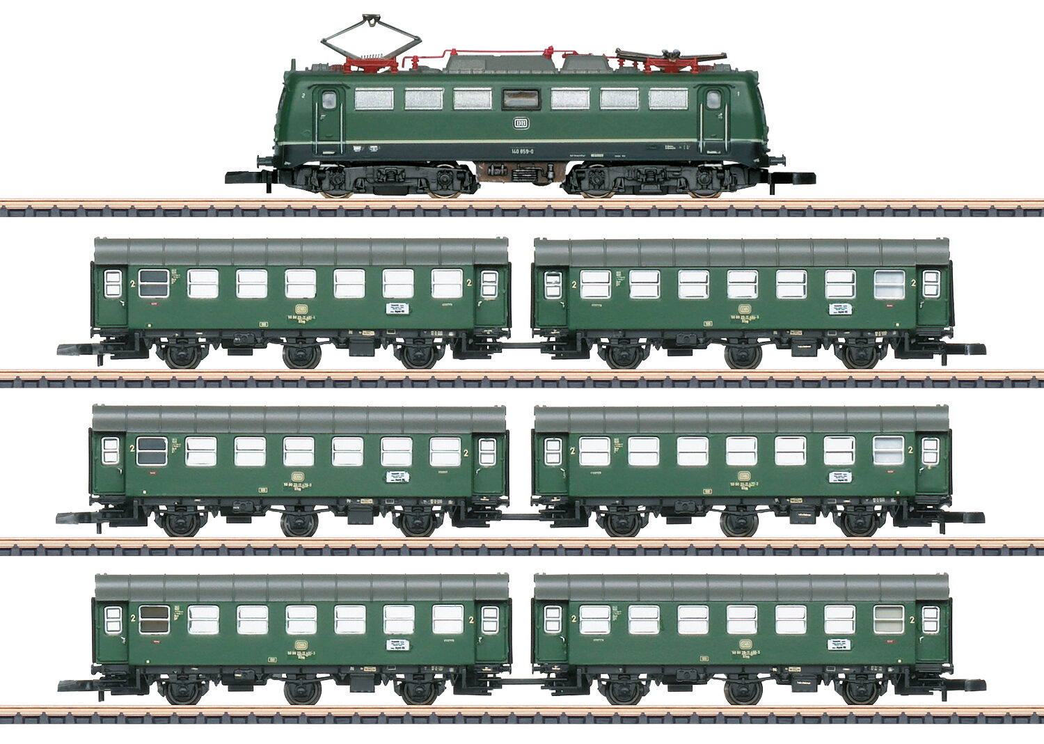 Vorbild: Elektrolokomotive BR 140 chromoxidgrün und 3 Personenwagen-Paare aus 3-achsigen Umbauwagen B3yge der Deutschen Bundesbahn (DB). Alle Fahrzeuge im Zustand der Epoche IV um 1972