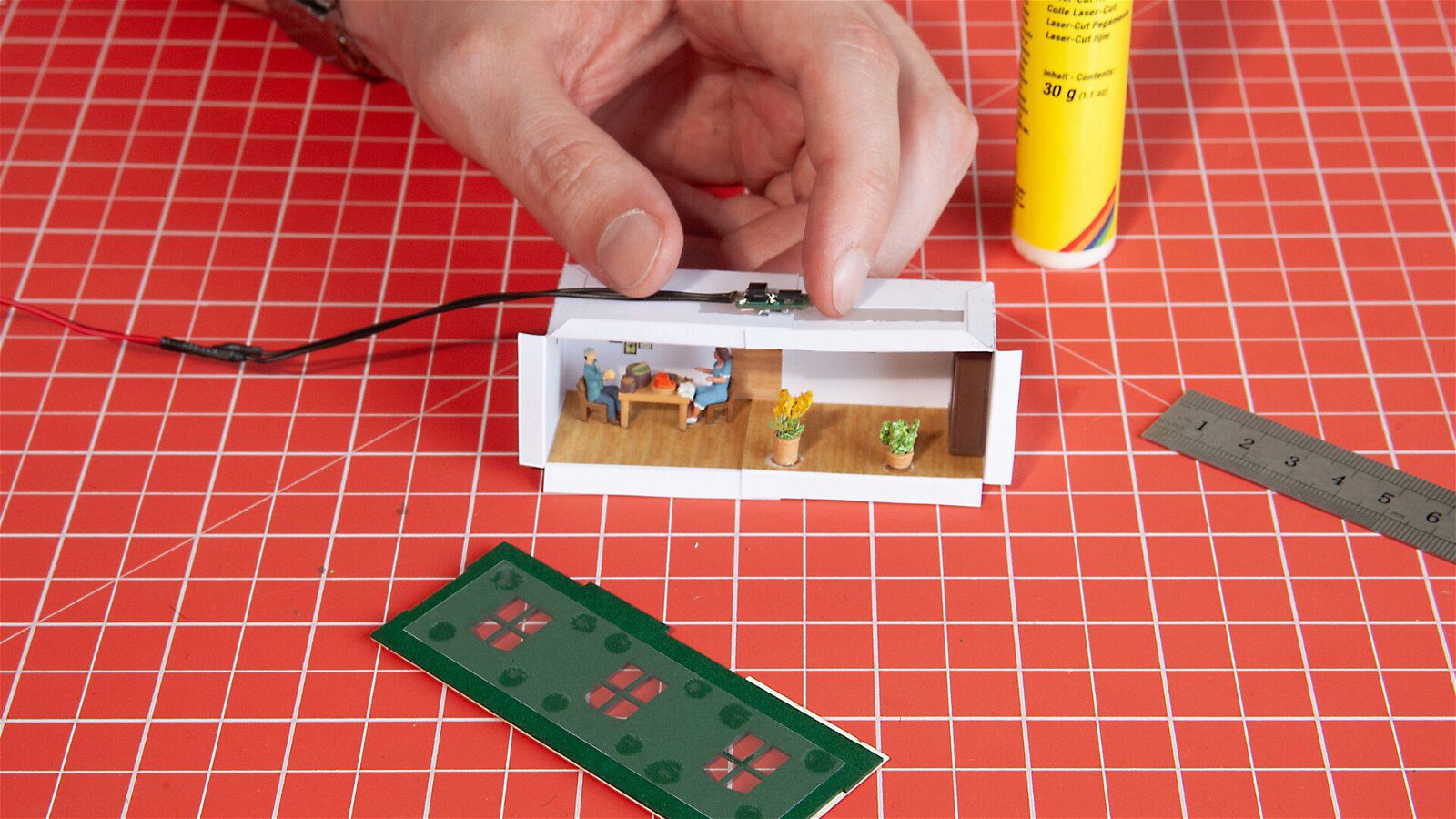 Die LEDs werden oben im Lichtraum befestigt. Das LED-Licht wird unterstützt durch die beiliegende Diffusionsfolie, realistisch im Raum verteilt. Wer will, hängt noch ein paar Gardinen auf und fertig ist ein weiteres Highlight in Ihrer Modell-Welt!