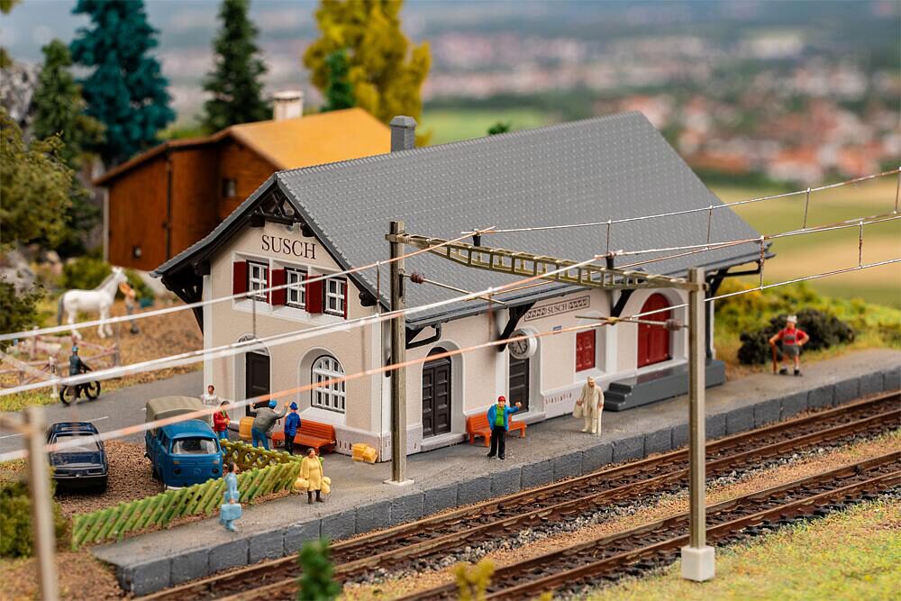 Dieser zauberhafte Bahnhof in N, der dem Originalbahnhof Susch am Fuße des Flüelapasses täuschend echt nachempfunden ist, beeindruckt mit einer digital bedruckten Fassade. Er befindet sich zwischen den Bahnhöfen Lavin und Zernez und fügt sich harmonisch in die landschaftliche Kulisse ein.