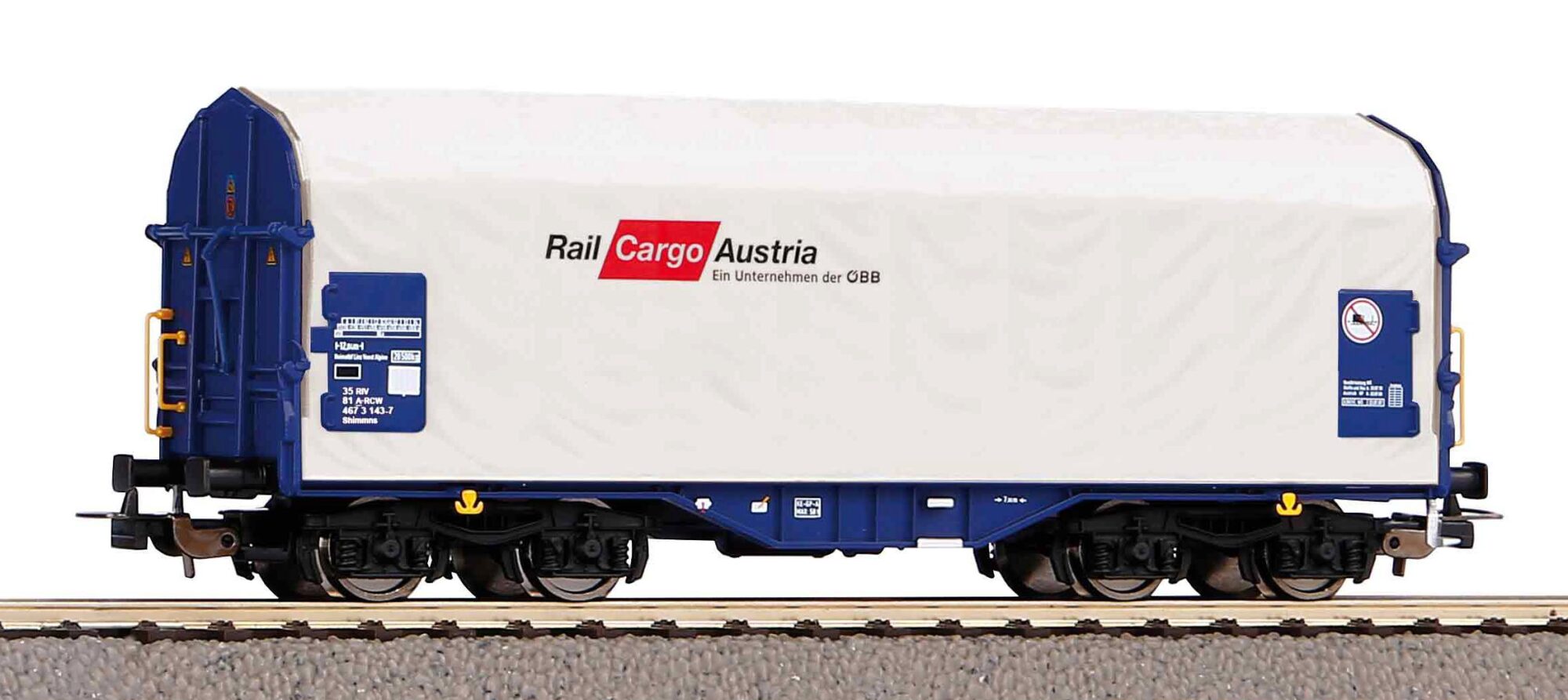Neuheit 2024: Druckvariante des Schiebeplanenwagens im Design der Rail Cargo Austria in Epoche VI. Das Modell überzeugt durch die realistische Wiedergabe der Planen, konturenscharfe Bedruckung und exzellente Rolleigenschaften.