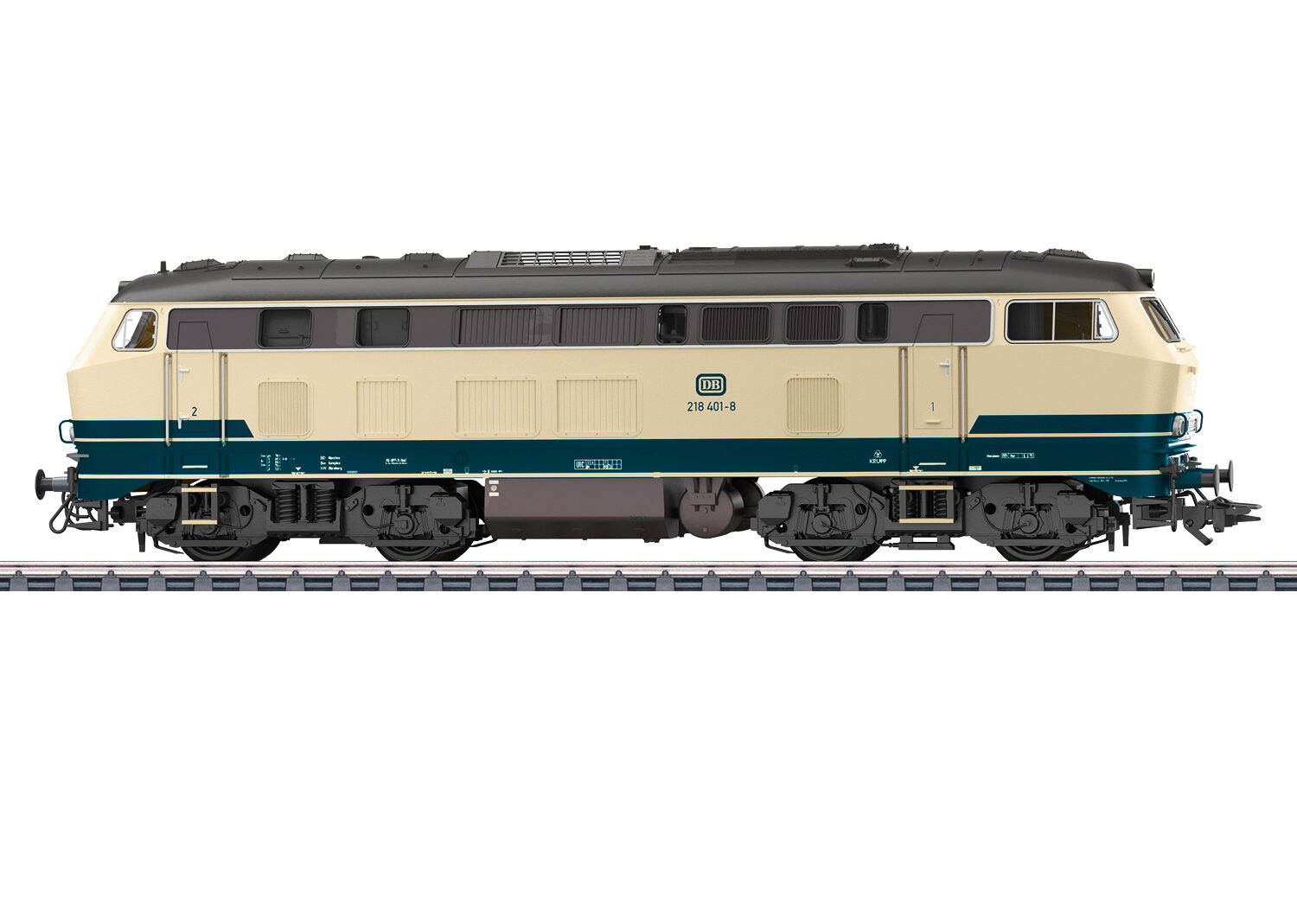 Vorbild: Diesellokomotive Baureihe 218 der Deutschen Bundesbahn (DB). Ozeanblau/Elfenbeinfarbene Grundfarbgebung. Betriebsnummer 218 401-8. Betriebszustand ab 1976