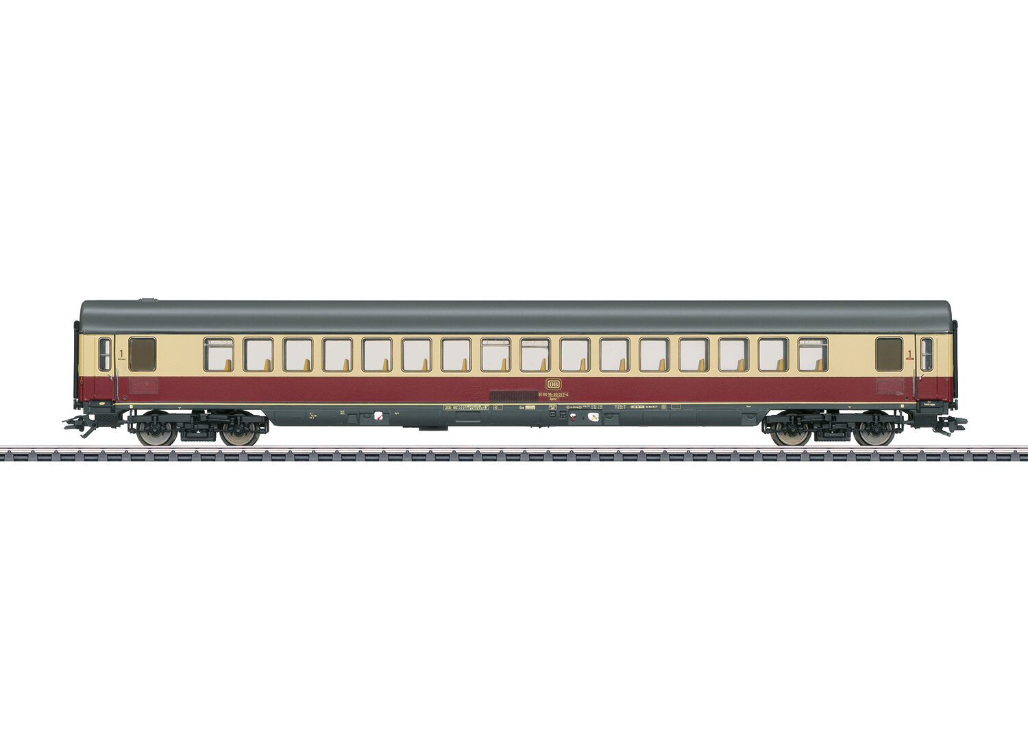Vorbild: Schnellzug-Großraumwagen Bauart Apmz 121, 1. Klasse der Deutschen Bundesbahn (DB). Purpurrot/Beige Grundfarbgebung. Betriebszustand ab 1980