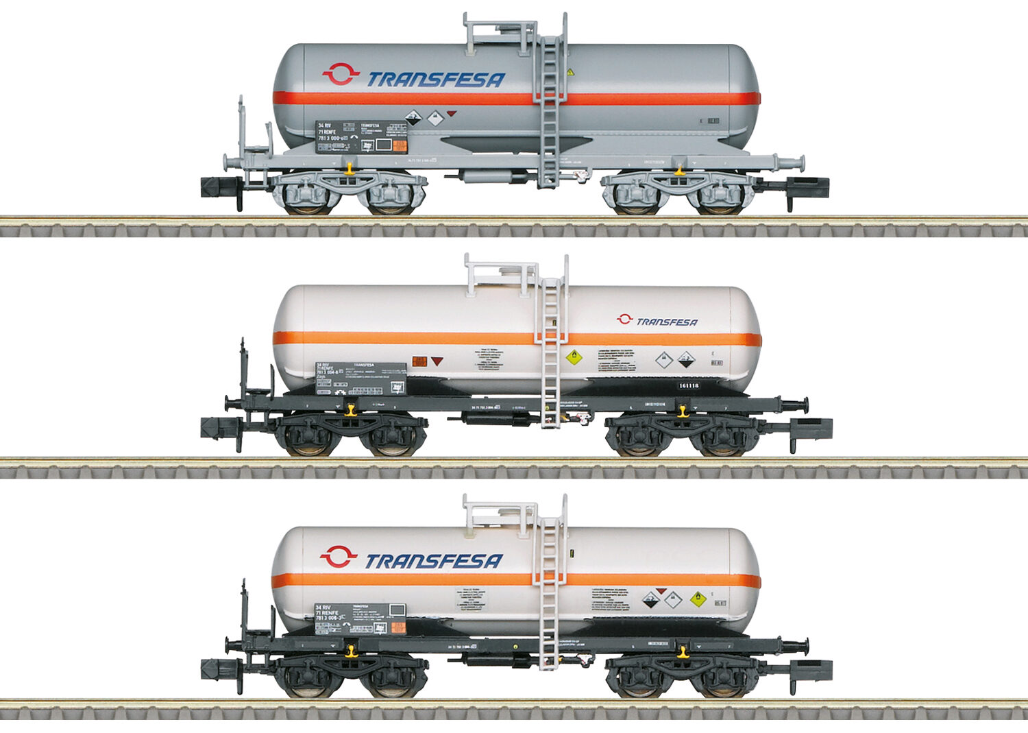 Vorbild: Drei 4-achsige Chemie-Kesselwagen der Firma TRANSFESA eingestellt bei der Spanischen Staatseisenbahn (RENFE). Betriebszustand um 2000