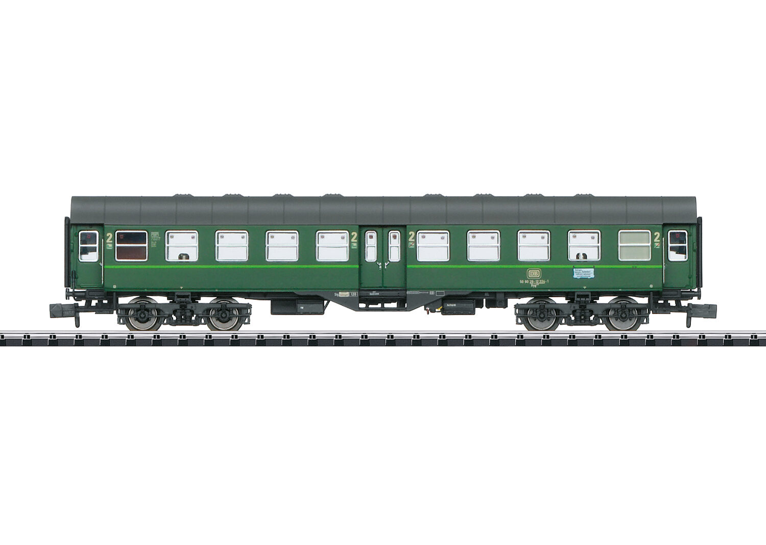 Vorbild: vierachsiger Umbauwagen 2. Klasse Byg 515 der Deutschen Bundesbahn (DB). Ausführung um 1984 in chromoxidgrüner Farbgebung für den Einsatz auf der Allgäu-Zollern-Bahn