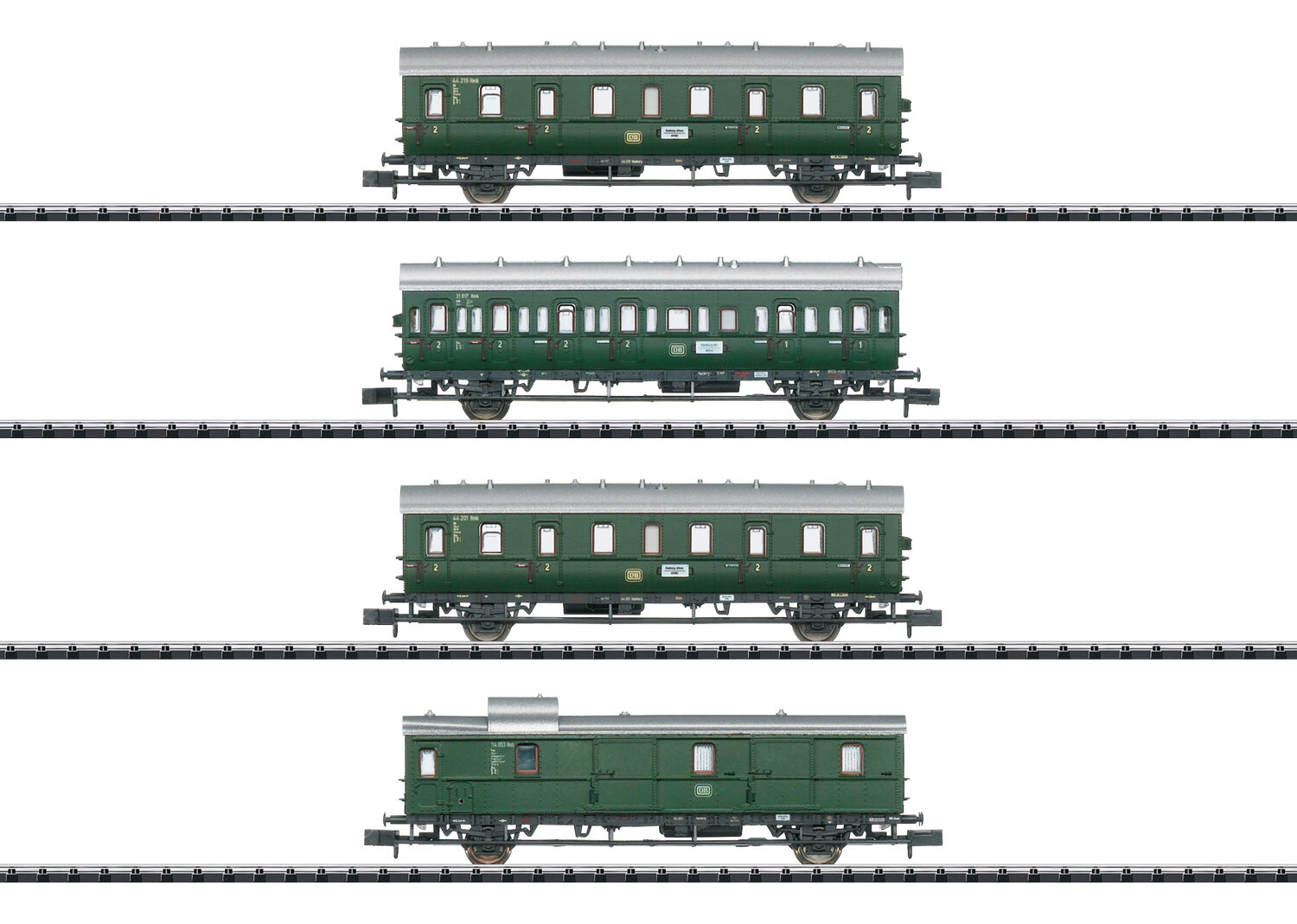 Vorbild: 1 Einheits-Abteilwagen 1./2. Klasse AB-21, 2 Einheits-Abteilwagen 2. Klasse Bd-21b, 1 Gepäckwagen Pwi-23 im Zustand um 1960 der Deutschen Bundesbahn (DB)