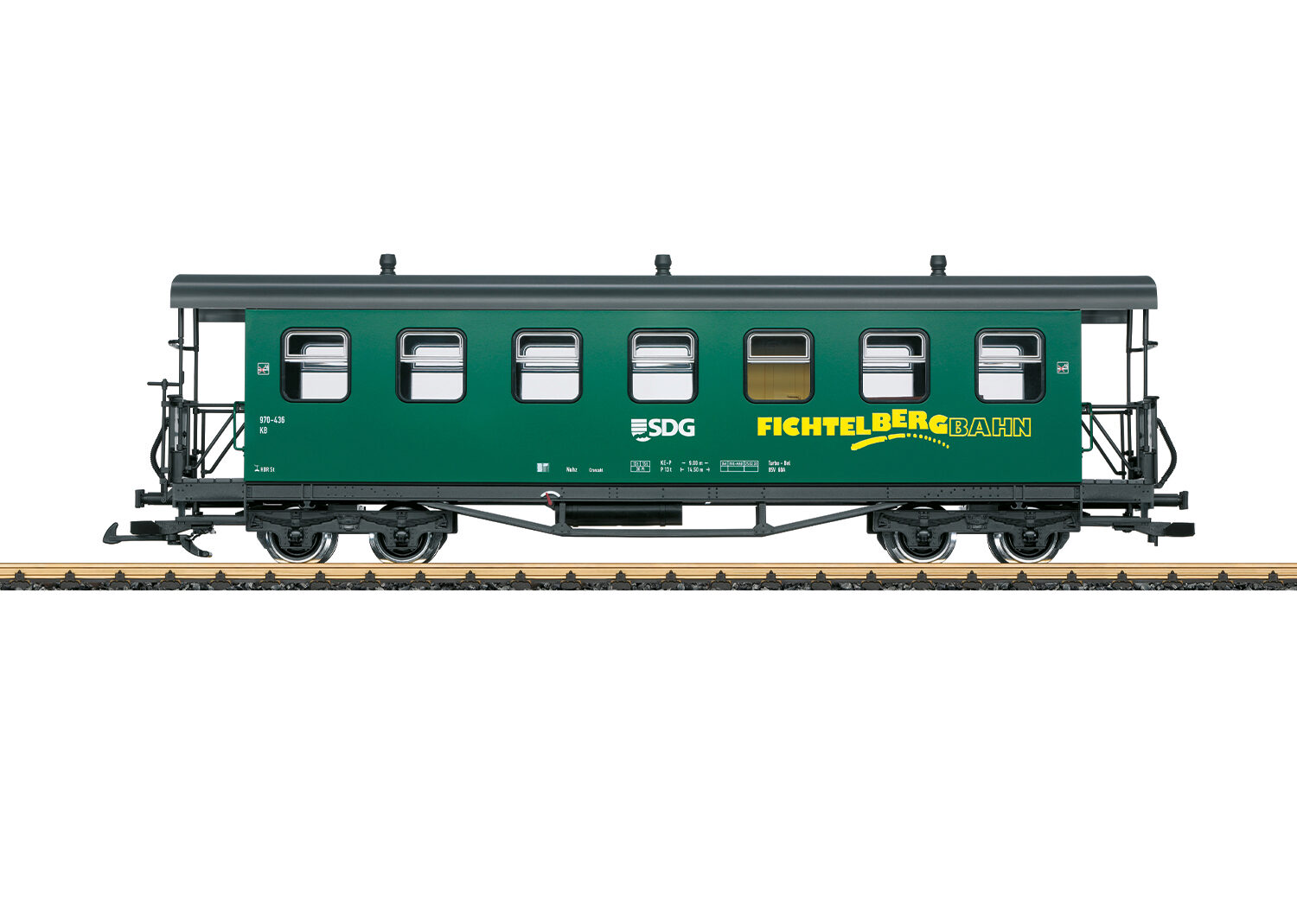 Modell eines Bistrowagens der Bauart KB der SDG, wie er heute noch bei der Fichtelbergbahn im Einsatz ist. Originalgetreue Farbgebung und Beschriftung der Epoche VI. Vollständige, vorbildgetreue Inneneinrichtung. Metallradsätze.