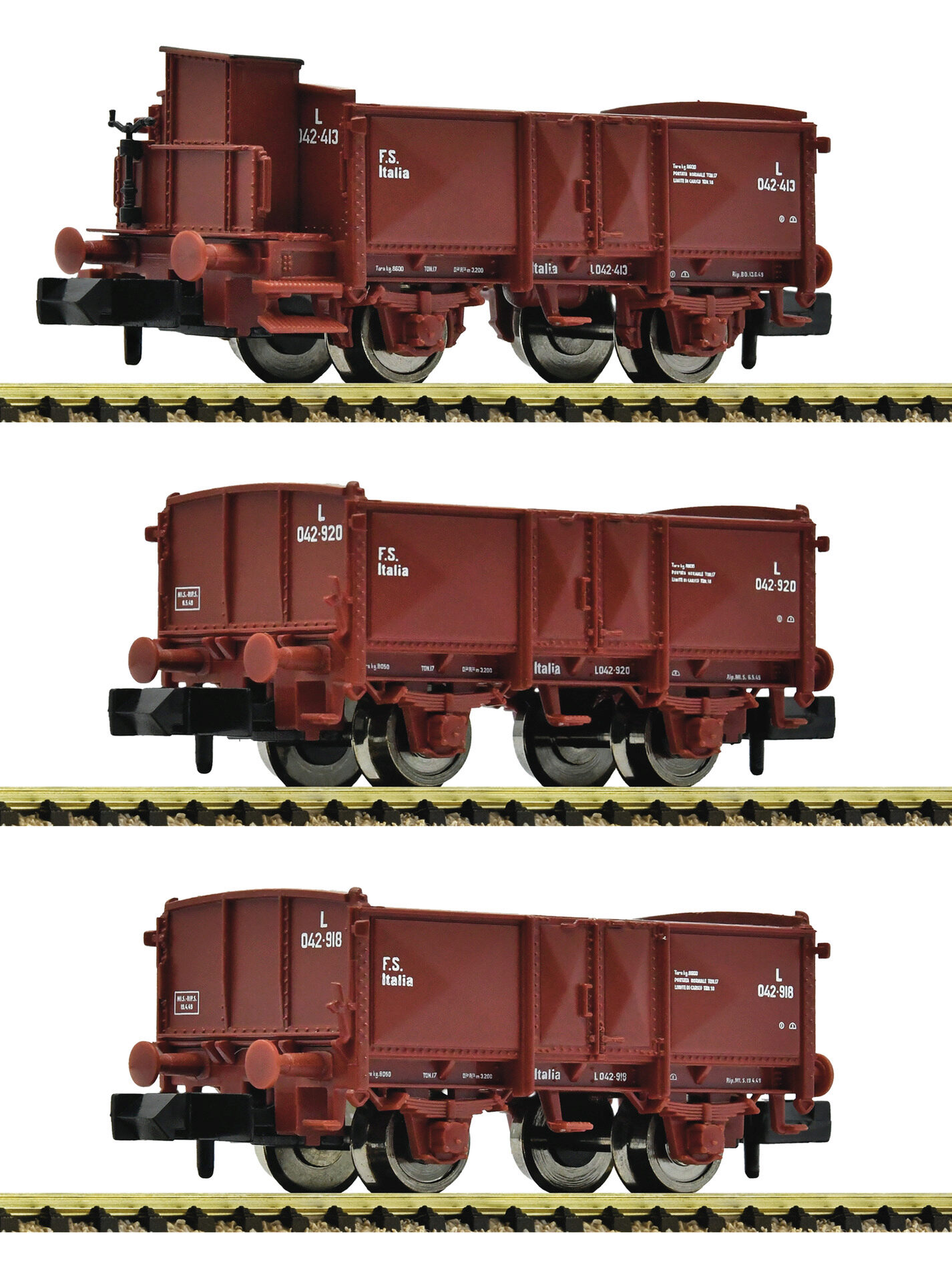 Wagenset mit drei offenen Güterwagen der Italienischen Staatseisenbahnen.