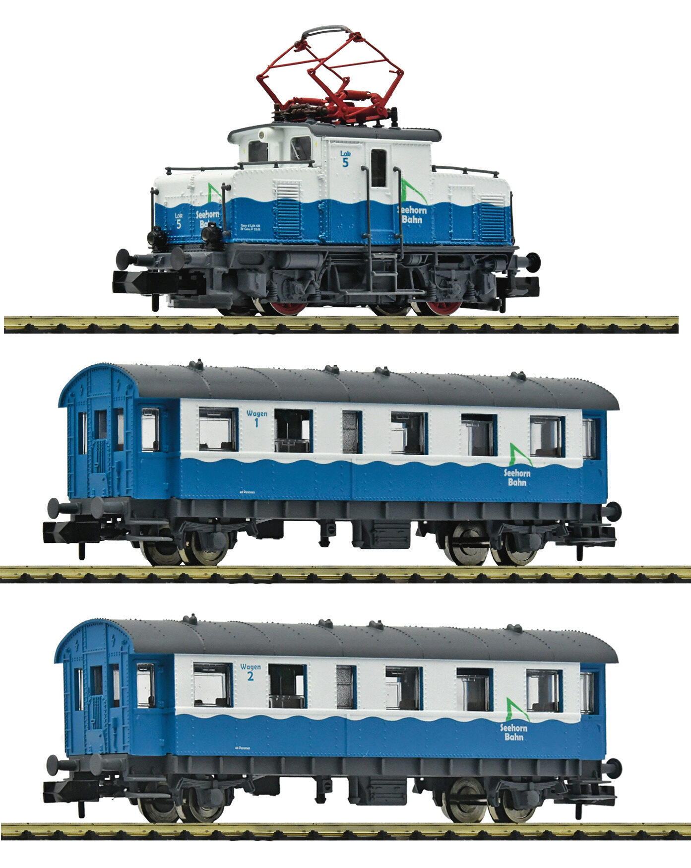 Zugset mit einer elektrischen Zahnradbahn-Lok (ähnlich E 69) und zwei Personenwagen der „Seehorn Bahn“.