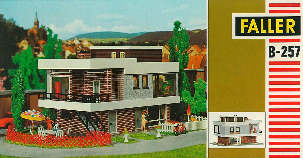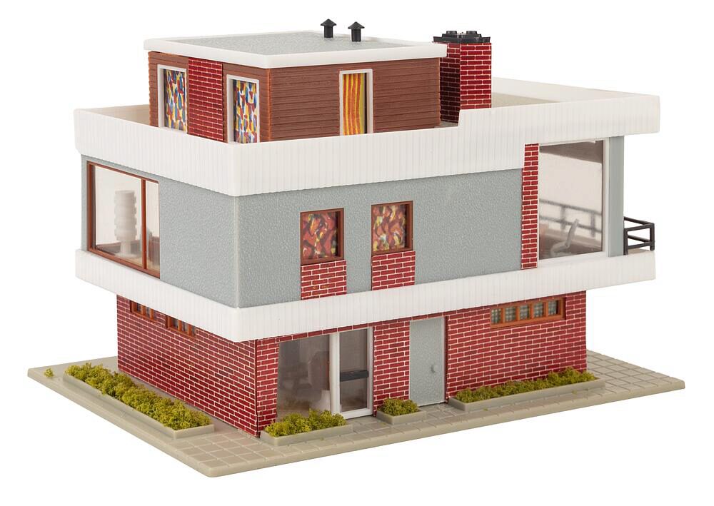 Ein Modell der Klassiker-Reihe, Erstauflage 1974. Das Modell präsentiert ein zweistöckiges Flachdachgebäude mit einem versetzten Staffelgeschoss, das dem Stil dieser Ära entspricht. Die Fassaden zeigen eine harmonische Vielfalt aus rotem Backstein, Putz und Holzverkleidung. Der Zugang zur zweiten Etage erfolgt über eine Außentreppe, während großflächige Fenster Einblicke in das Interieur gewähren, das die charakteristische und umfangreiche Inneneinrichtung des Bausatzes widerspiegelt.