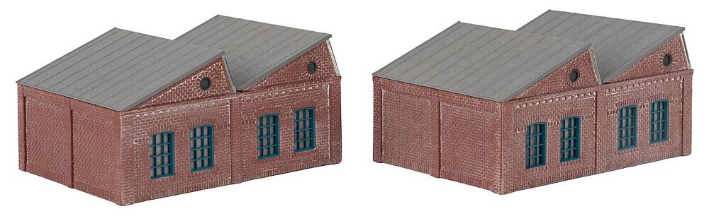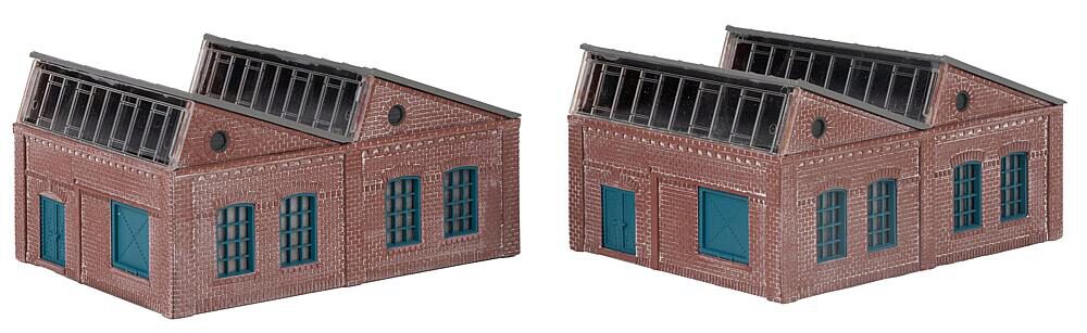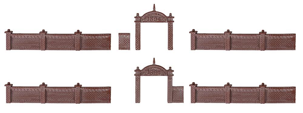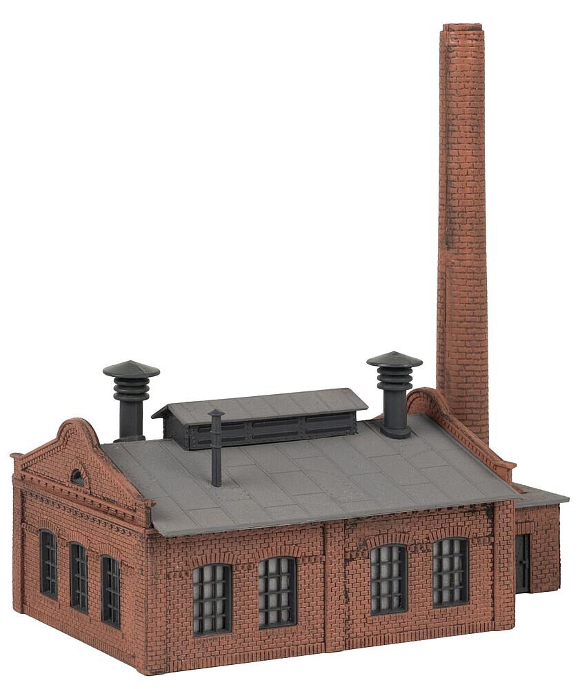 Fabrik aus der Jahrhundertwende mit roten Backsteinwänden und einer großen Halle mit angebauten Kaminhaus und imposantem Schornstein. Ein großzügiges Ensemble aus dem Hauptgebäude sowie zwei kleineren Hallen mit markanten Dachoberlichtern ergänzen die Szenerie. Zudem liegen dem Bausatz zwei repräsentative Backsteinmauerumzäunungen mit Toren bei.