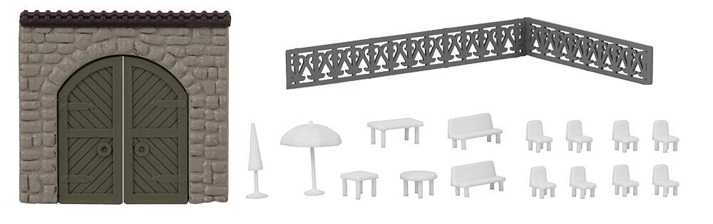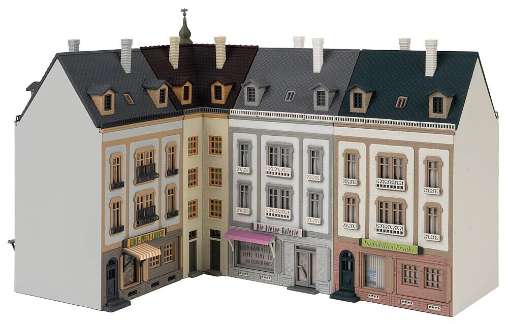 Vier farbenfrohe Wohn- und Geschäftshäuser zieren die lebhafte Innenstadt. Jedes einzelne ist mit kunstvoll verzierten Fenstern und Balkonen geschmückt. Besonders sticht das Eckhaus der Häuserzeile hervor, das mit seinem charmanten Erker und einem kleinen Türmchen ein wahrer Blickfang ist. In den oberen Etagen befinden sich Altstadtwohnungen, während unten in der belebten Geschäftsstraße ein bunter Mix aus liebevoll gestalteten Restaurants und weiteren ansprechenden Läden die Miniatur-Passanten anzieht. Ein rustikaler Steinbogen mit Holztor, Sitz- und Essgelegenheiten, Zäune und Schirme schmücken die Modellbauszenerie.