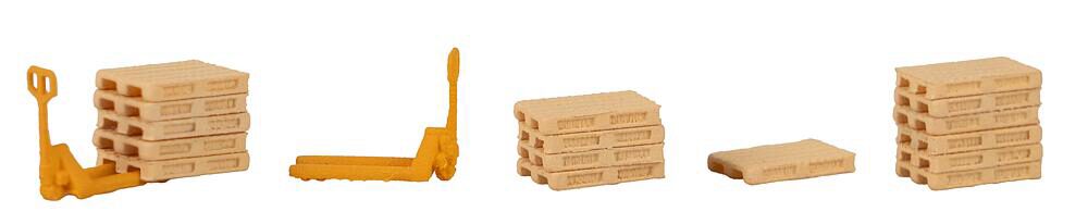 Set bestehend aus zwei Hubwagen und 16 Paletten. Unverzichtbares Zubehör im Logistikbereich.