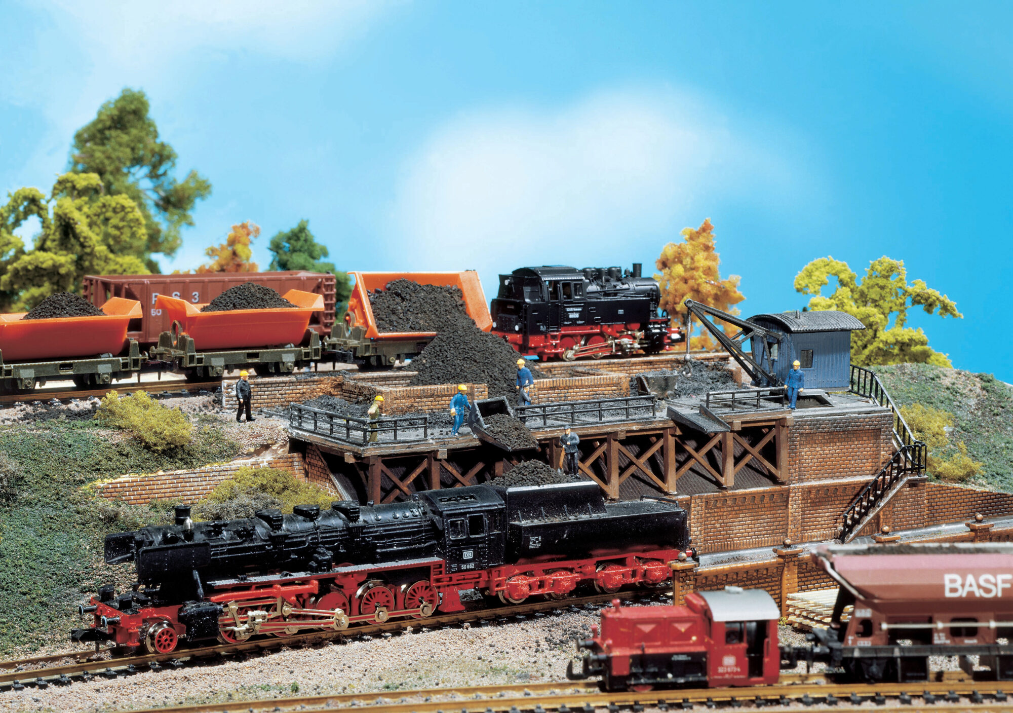 Über das höherliegende Ladegleis wurde die Kohle angeliefert und mit Kohlenhunten über Schütten direkt in die Tender der tieferstehenden Lokomotiven geschüttet. Das Modell ist beliebig verlängerbar.