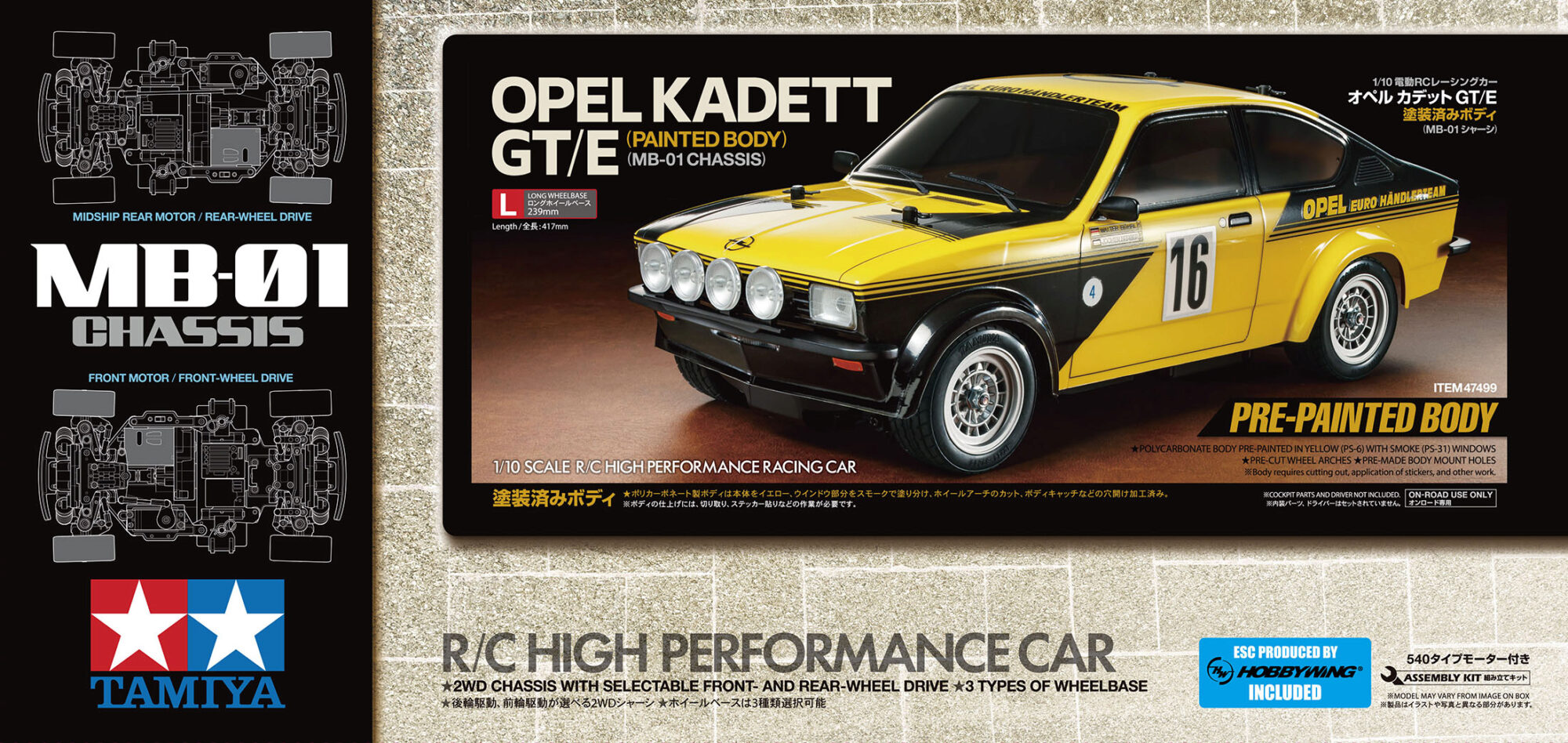 TAMIYA präsentiert Opel Kadett GT/E Rallye auf dem MB-01 Chassis.
