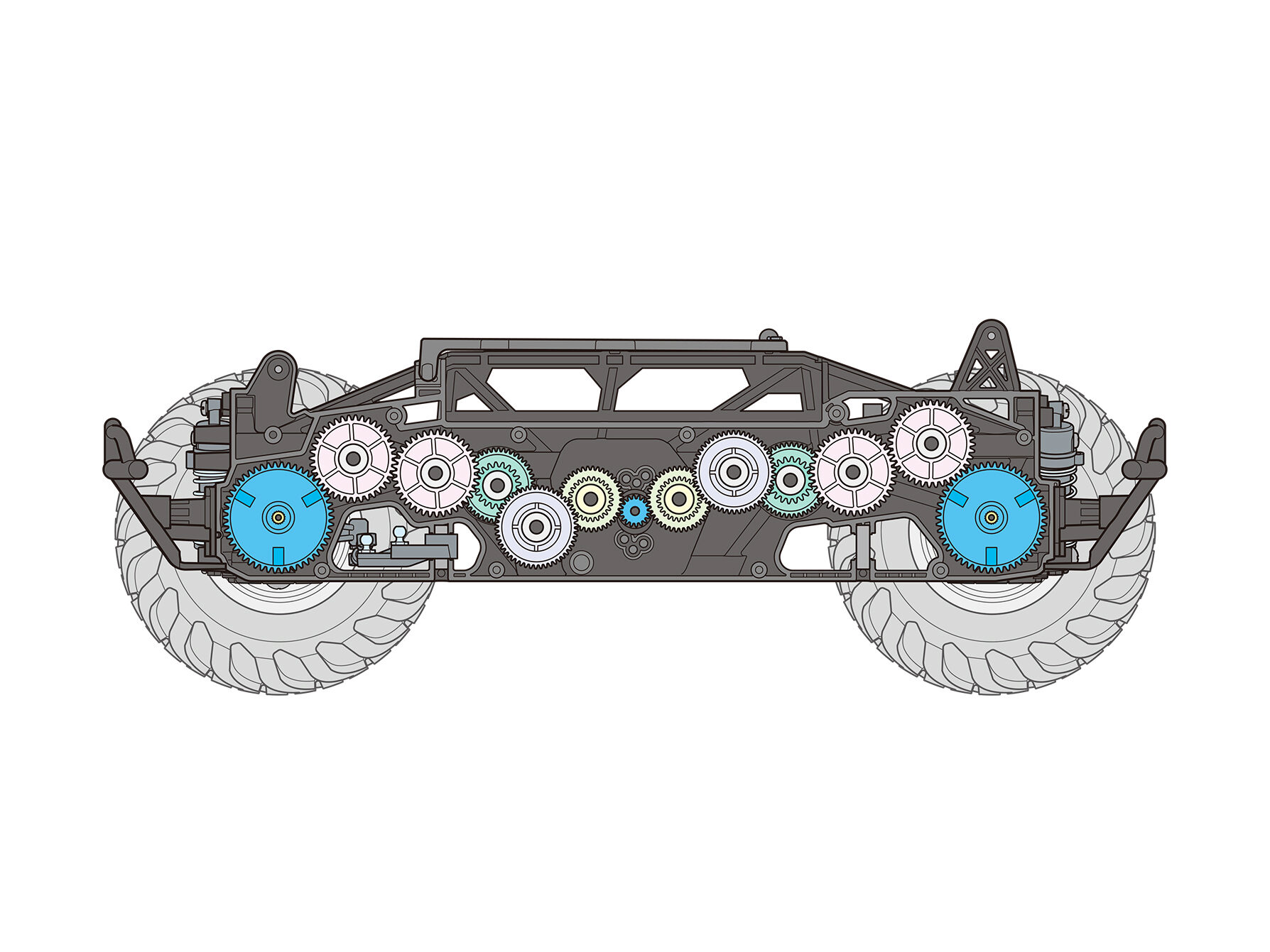 Vorder- und Hinterachse erfolgt über Zahnräder im Chassisinneren.