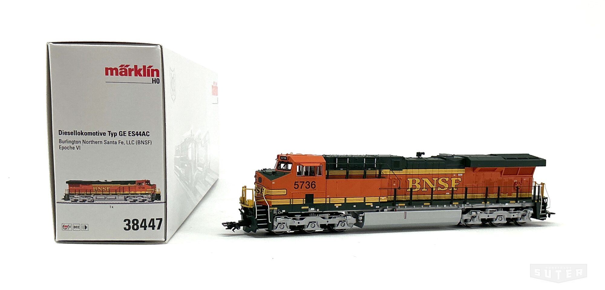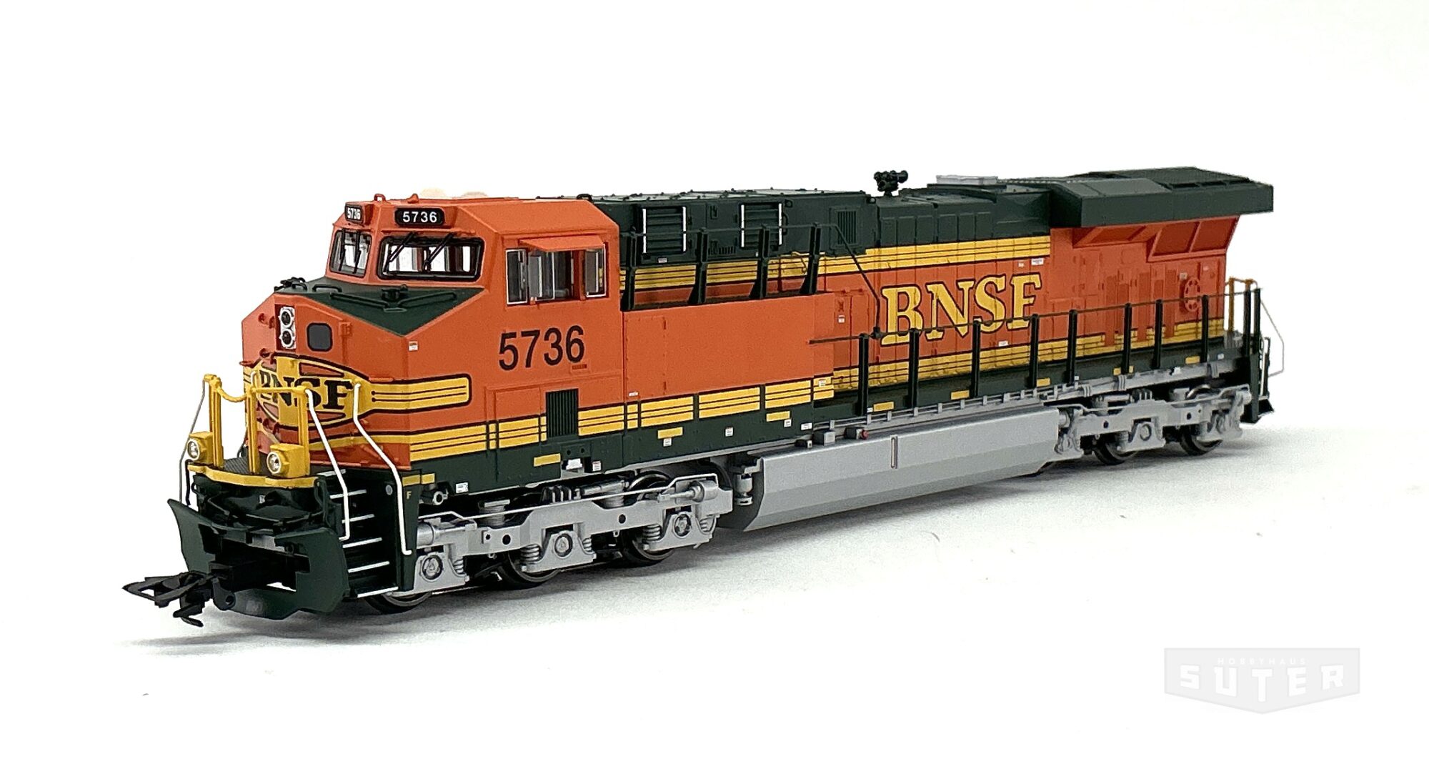Vorbild: Schwere dieselelektrische Güterzuglokomotive Typ General Electric ES44AC der Burlington Northern Santa Fe, LLC (BNSF). Orange Grundfarbgebung. Betriebsnummer 5736. Aktueller Betriebszustand