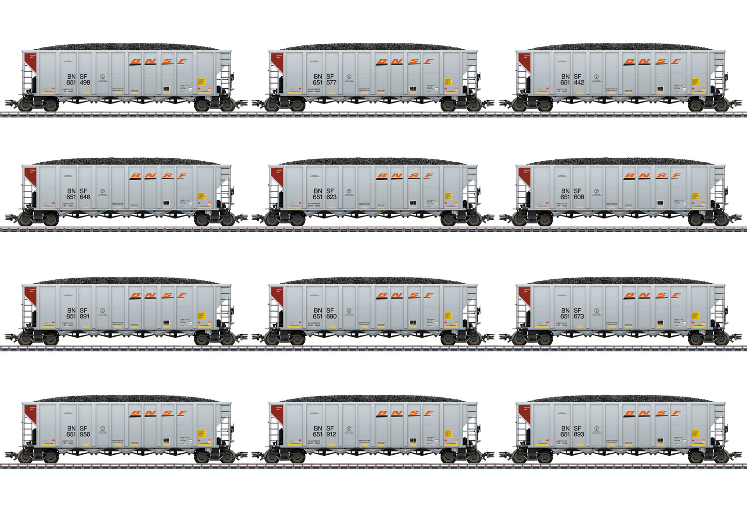 Vorbild: Zwölf Kohletransportwagen, sogenannte Hopper Cars, der Burlington Northern Santa Fe, LLC (BNSF). Ausführung mit fünf Entladeeinrichtungen am Wagenboden. Aktueller Betriebszustand