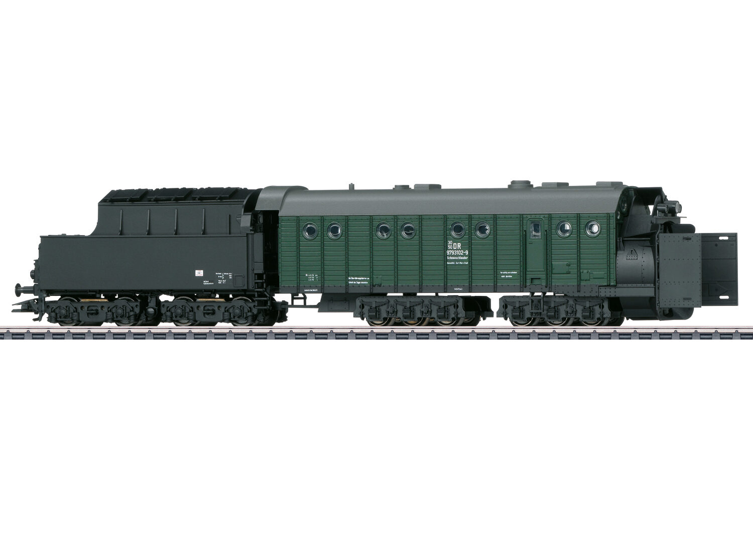 Modell: Mit Digital-Decoder, angetriebenem rotierendem Schleuderrad und Zusatzfunktionen. Aufbau aus Metall. Separat angesetzte Handläufe. Detaillierte Nachbildung des Schleudervorbaus. Bewegliche Seitenflügel und Leitschaufeln. Arbeitsscheinwerfer und Spitzensignal beleuchtet, digital schaltbar. Serienmäßig eingebauter Raucheinsatz. Im konventionellen Betrieb ist der Arbeitsscheinwerfer und das Schleuderrad sowie die Rauchsatzansteuerung funktionsfähig. Tender mit beweglichen Deckeln am Kohlekasten. Länge geschlossen 24,2 cm.