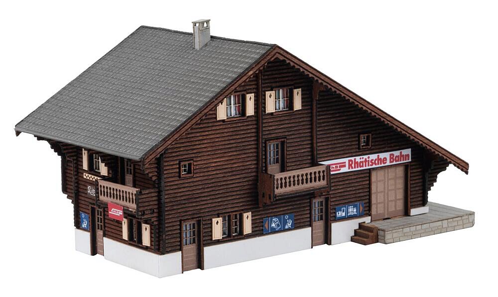 An der historischen Arosabahn in der Schweiz, die seit 1914 durch atemberaubende Landschaften fährt, steht der historische Bahnhof »Litzirüti« als letzte Schanfigger Zwischenstation auf dem Weg nach Arosa. Inspiriert vom Original versprüht das Modell mit seiner dunklen Holzverkleidung und den hellen Fensterläden den Charme vergangener Zeiten. Das tiefe Dach aus grauen Ziegeln krönt die Station. Das Gebäude harmoniert perfekt mit der umliegenden Natur und lädt Miniatur-Fahrgäste dazu ein, einen Moment auf Ihrer Reise innezuhalten, und ist perfekt geeignet, um die Modellbahnanlage zu erweitern.