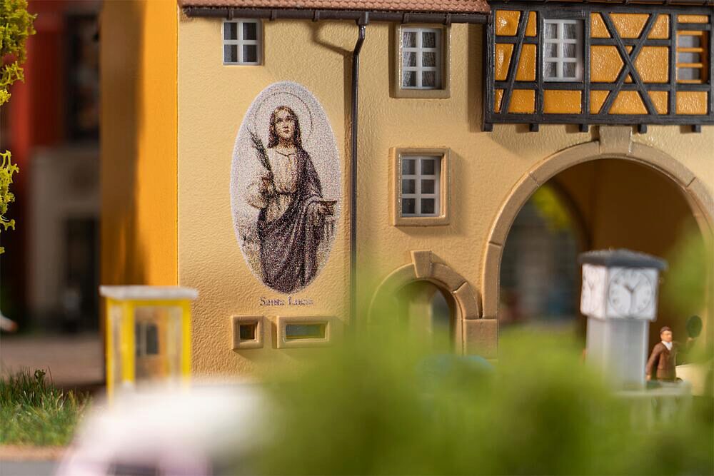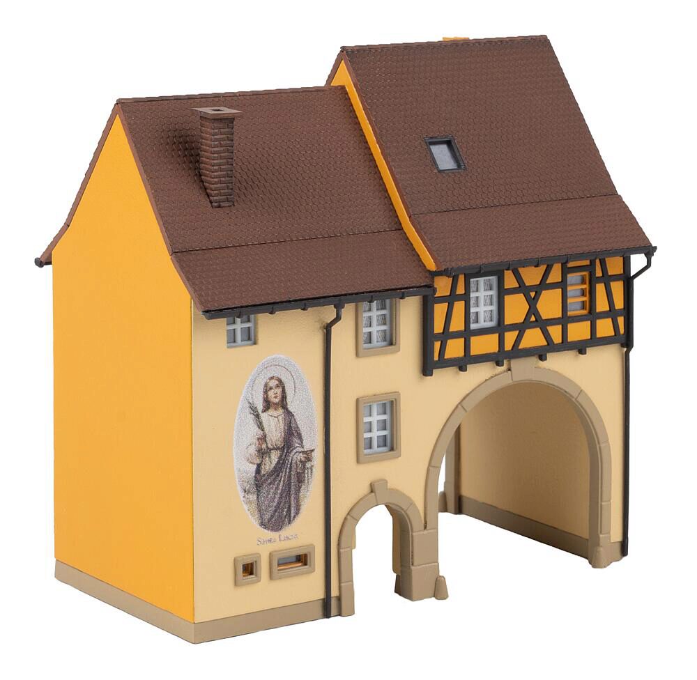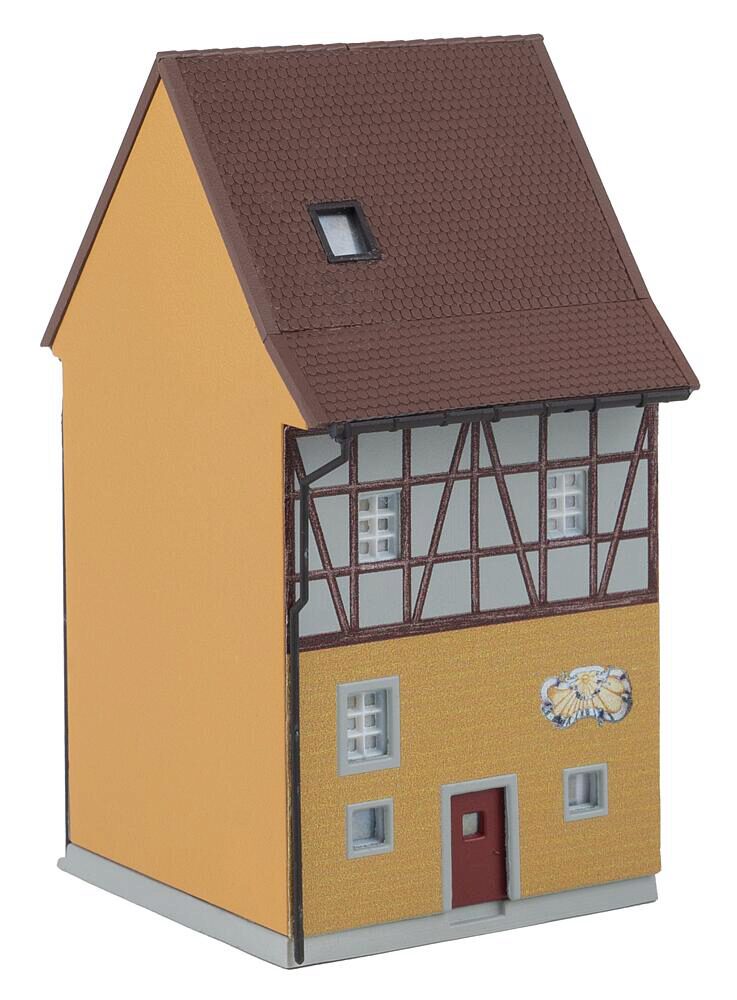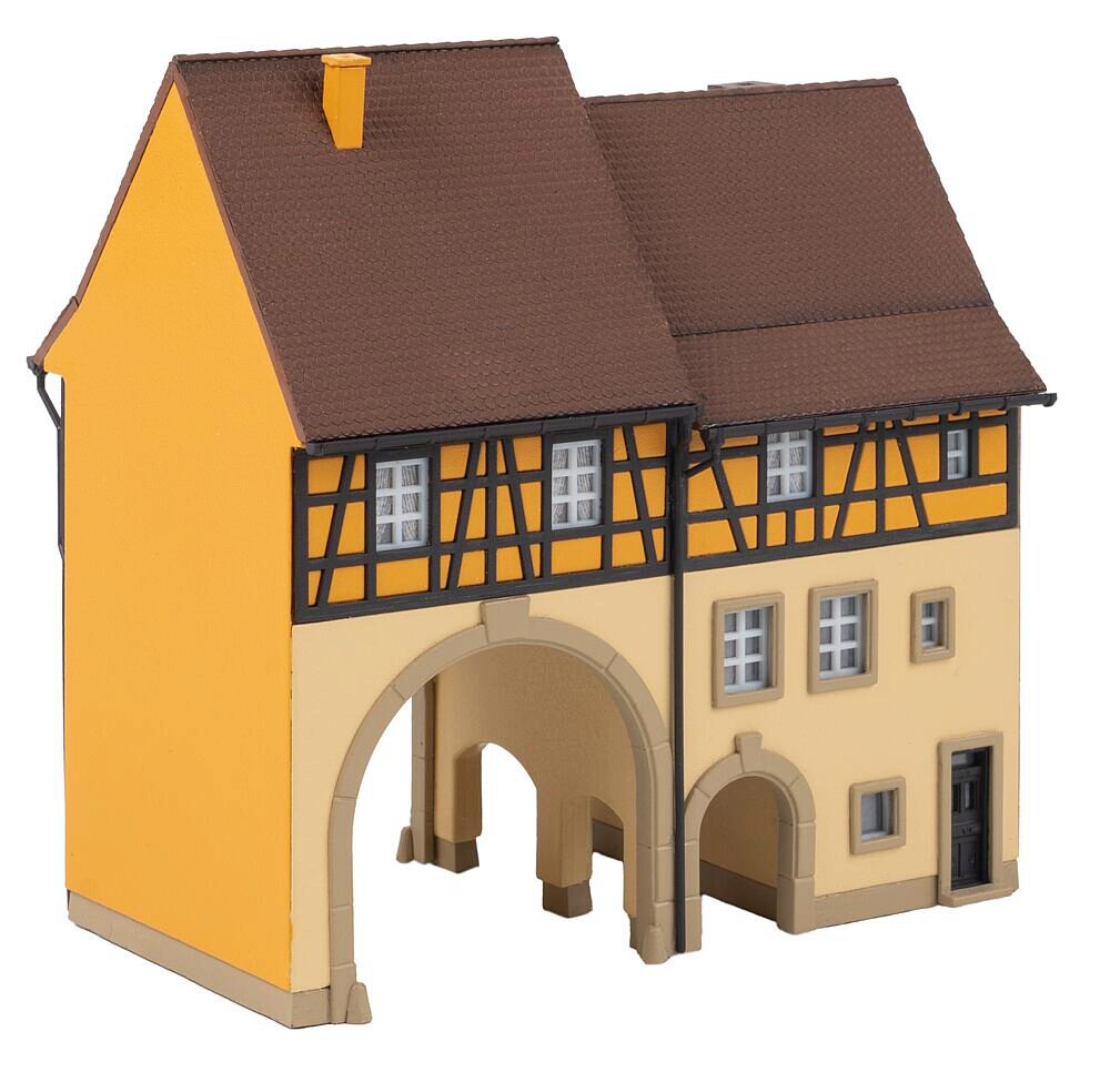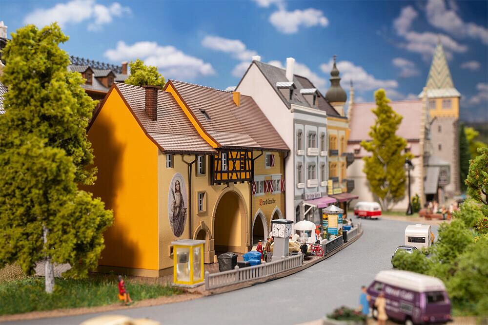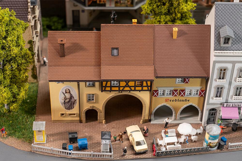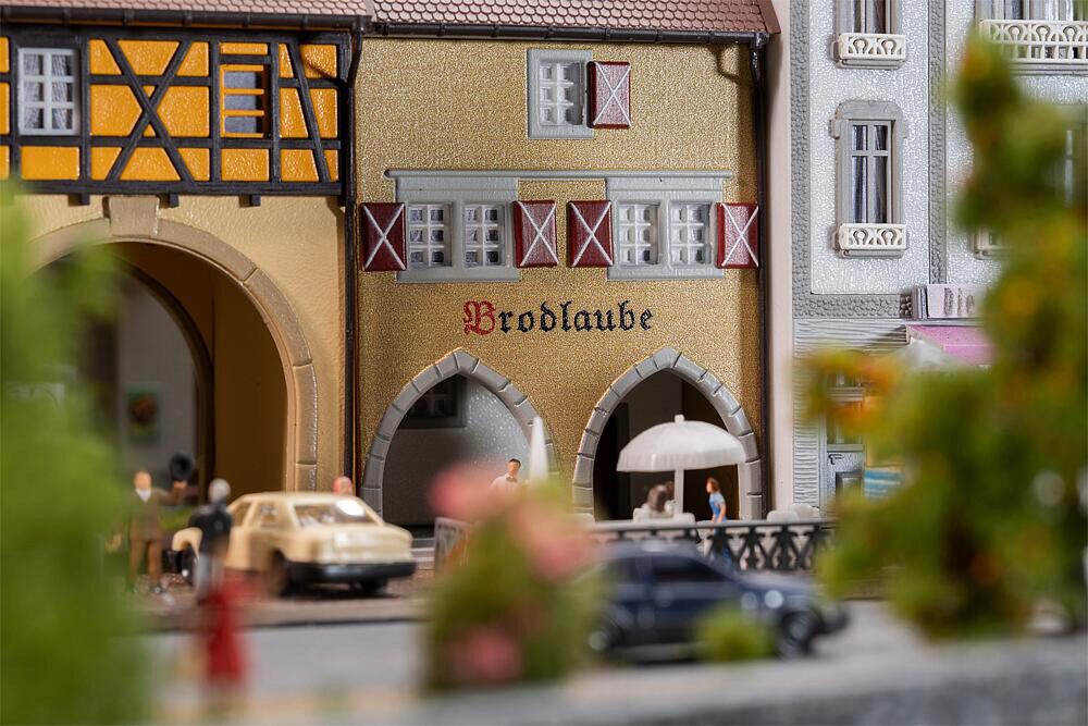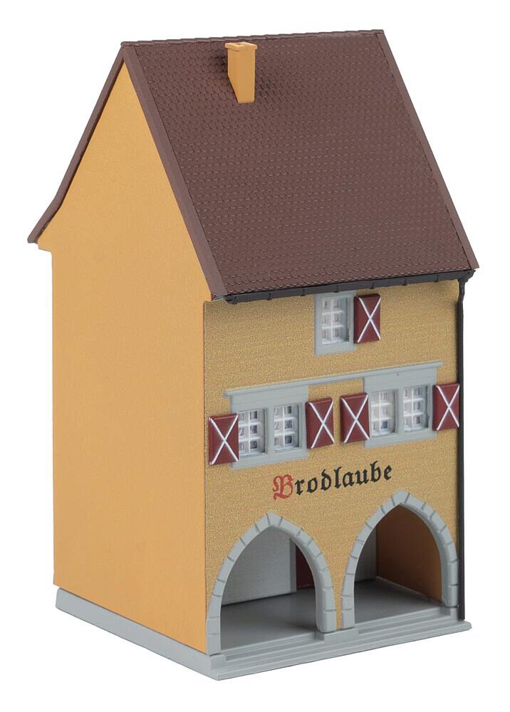 Diese kleine Stadthauszeile (aufgeteilt in zwei separate Häuser) verschönert die Miniatur-Innenstadt und ist durch ihren Altbaustil mit Fachwerkelementen, zwei großen Durchgangspassagen, Satteldächern und weiteren detailverliebten Verzierungen im Digitaldruck ein echter Hingucker. Das Modell ist nach dem Vorbild der »Brotlaube« auf der Insel Lindau im Bodensee gestaltet. Früher war die »Brotlaube« eine Bäckerei, heutzutage ist sie allerdings zu einem Hotel umfunktioniert worden. So oder so bereichert das Miniaturmodell mit etwas Altstadtcharme und Bodenseekultur jede Modellbauanlage.
