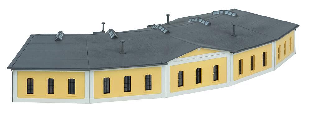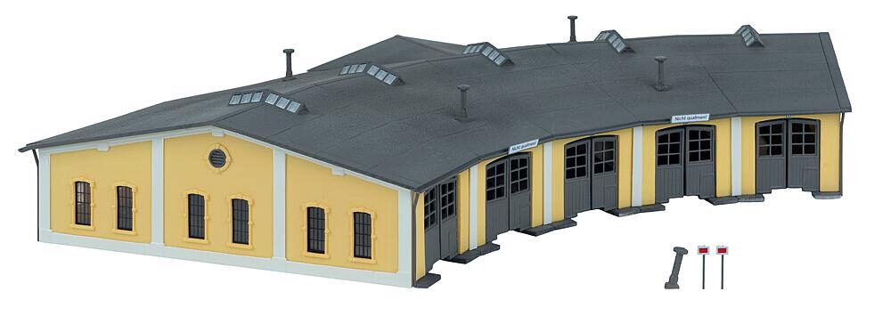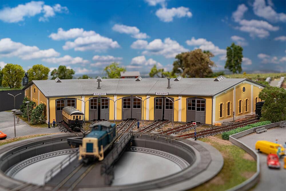Dampf zischt aus einer alten Lok und der eifrige Bahnbetrieb rund um den Lokschuppen erweckt das Miniaturmodell zum Leben. Der beeindruckende 5-ständige Ringlokschuppen »Freilassing« mit seinen Dachreitern und detailverliebten Seiten- und Rückfenstern ist eine Anlehnung an das denkmalgeschützte Original in Freilassing in Bayern. Dieses ist heutzutage der Sitz eines Eisenbahnmuseums (lokwelt.freilassing.de) und damit eine interessante Ergänzung für alle Modellbau- und Eisenbahn-Begeisterten. Die Formneuheit aus Kunststoff hat eine Teilung von 15 Grad. Lokomotiven können bis zu einer Länge von 120 mm problemlos einfahren.