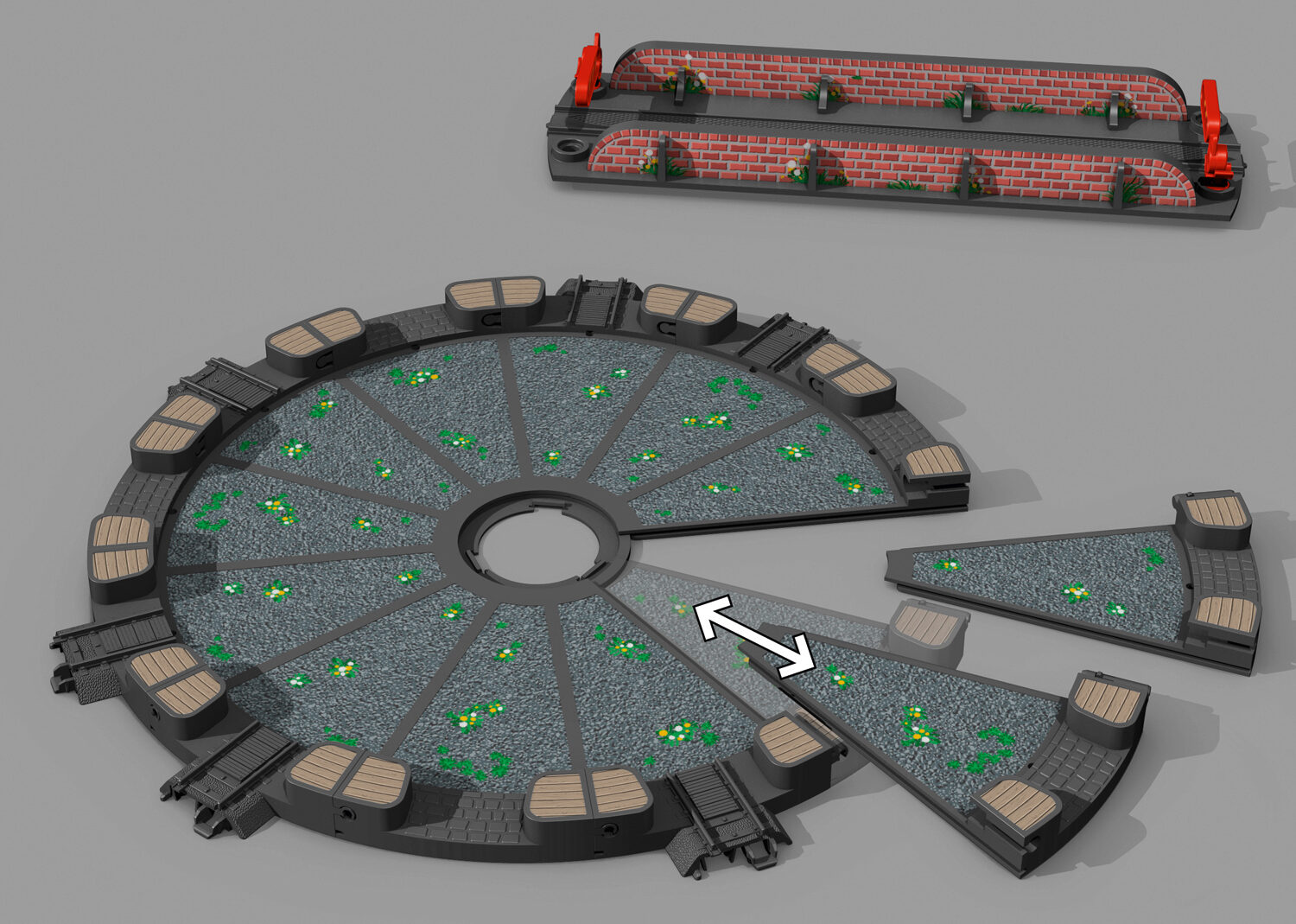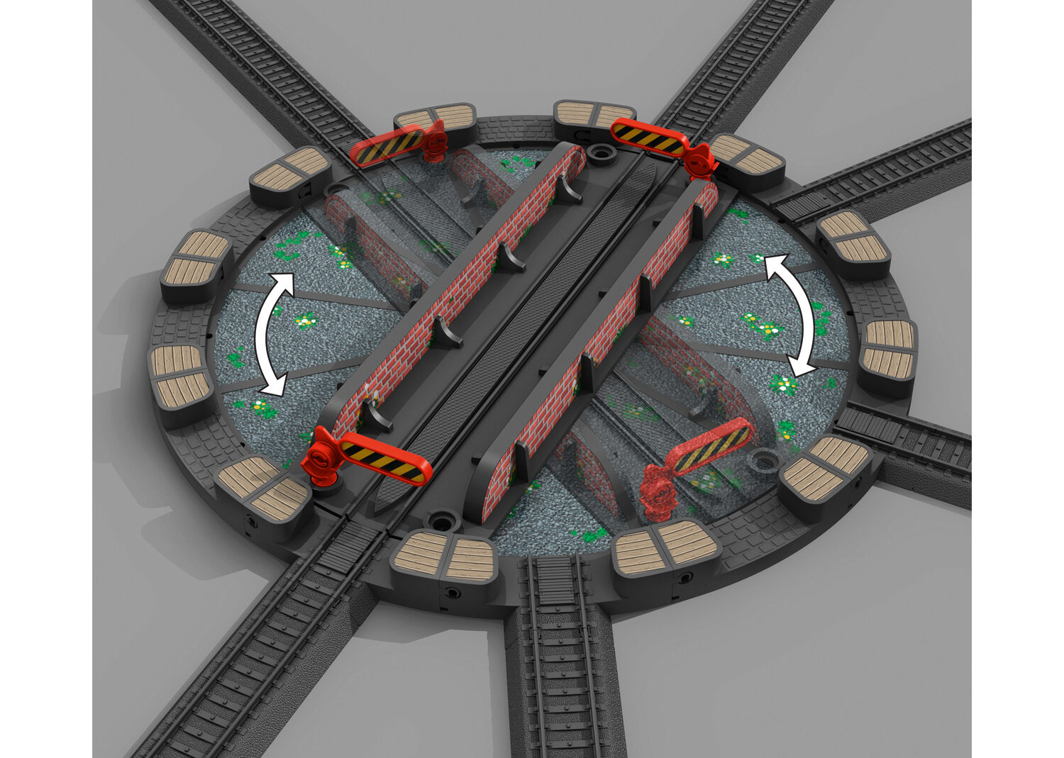 Steckbarer Bausatz aus stabilem Kunststoff gefertigt. Die Drehscheibe lässt sich aus wenigen Teilen kinderleicht zusammenbauen und ist daher für Kinder ab 3 Jahren geeignet. Die Drehbühne kann manuell bewegt werden. 6 Gleisanschlüsse für das Märklin Kunst