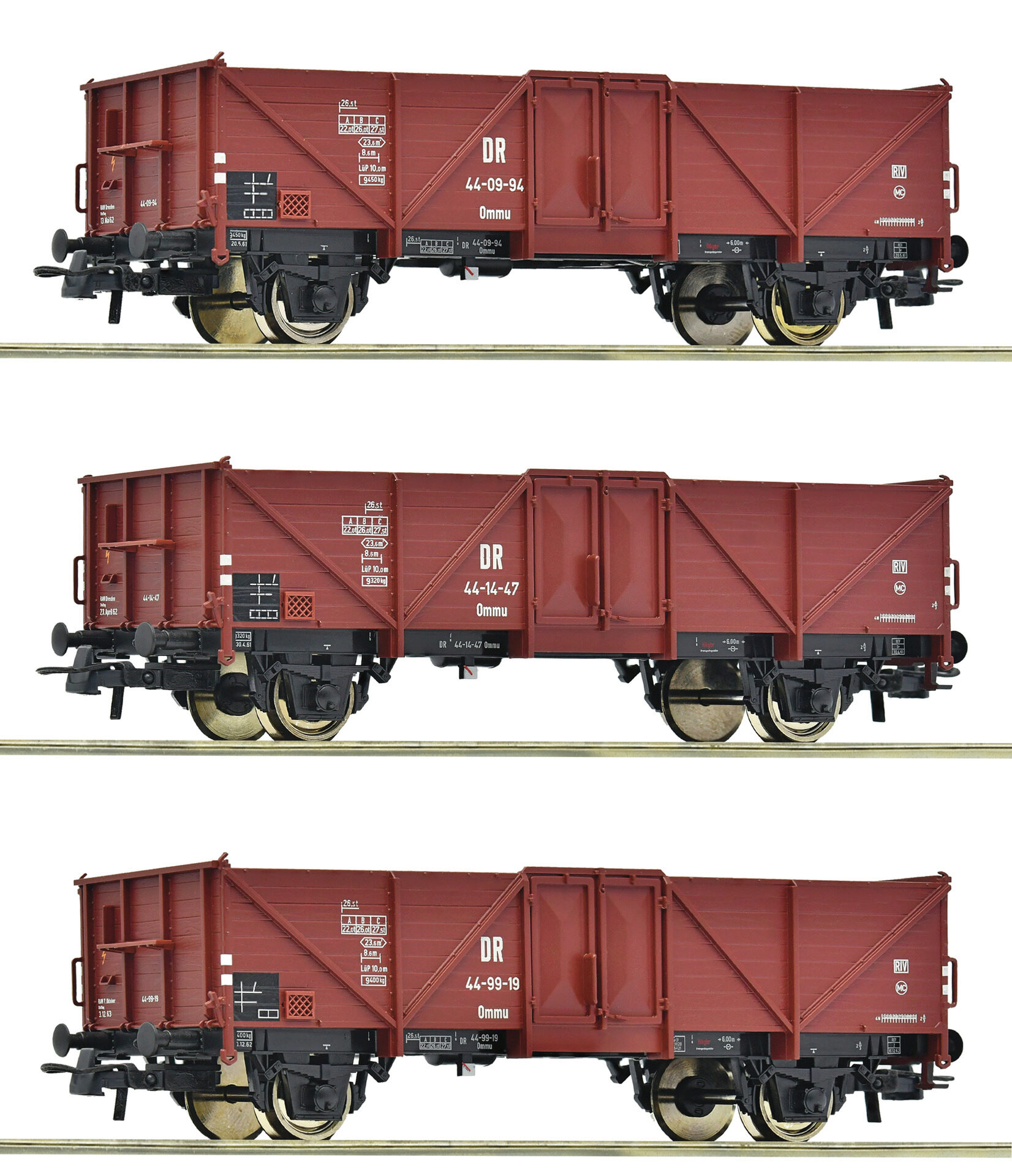 Wagenset mit drei offenen Güterwagen, Gattung Ommu, der Deutschen Reichsbahn.