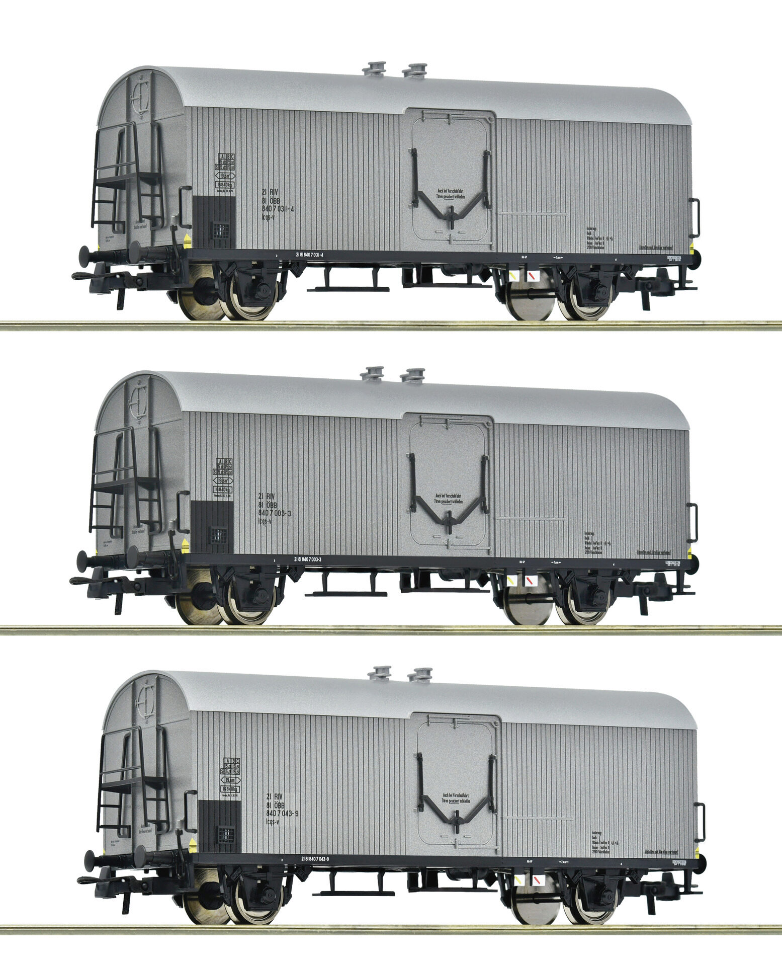 Wagenset mit drei Kühlwagen, Gattung Icrs-v, der Österreichischen Bundesbahnen.
