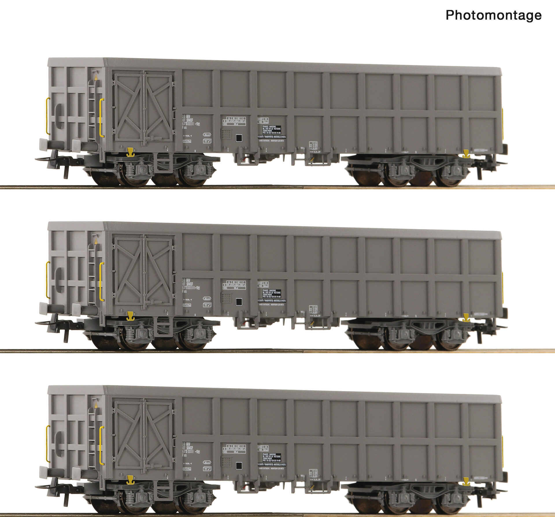 Wagenset mit drei 4-achsigen offenen Güterwagen, Gattung Fas, der Französischen Staatseisenbahnen.