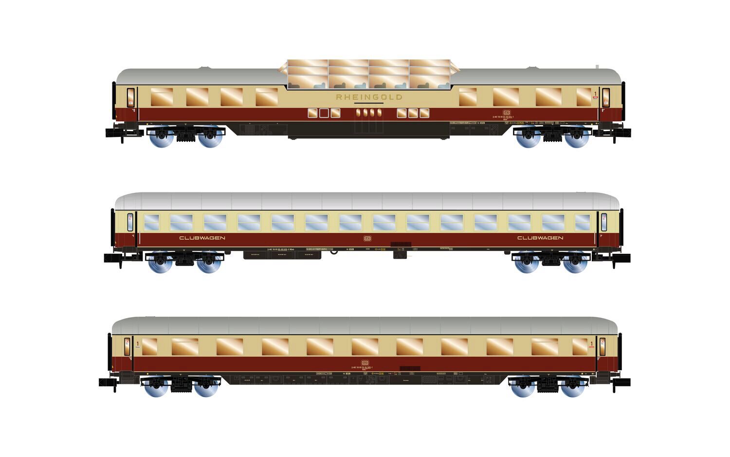 AKE Rheingold-Set 1 1x Aussichtswagen ARDm + 1x Clubwagen WGmh + 1x Wagen Avmz Ep. VI