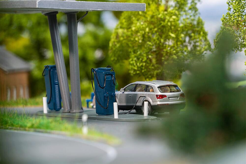 Die Energiewende hat nun auch die Modellwelt erreicht! Diese E-Tankstelle mit stilvoller Überdachung und unterschiedlich großen Ladesäulen für jeden Bedarf bringt frischen Schwung in Ihre Miniaturlandschaft. Sie ist nicht nur ein Zeichen für moderne Mobilität, sondern verleiht Ihrer Szenerie auch ein zeitgemäßes Flair. Die E-Tankstelle ist zudem für Car System Fahrzeuge geeignet.