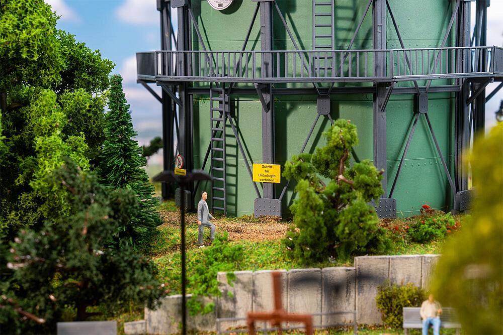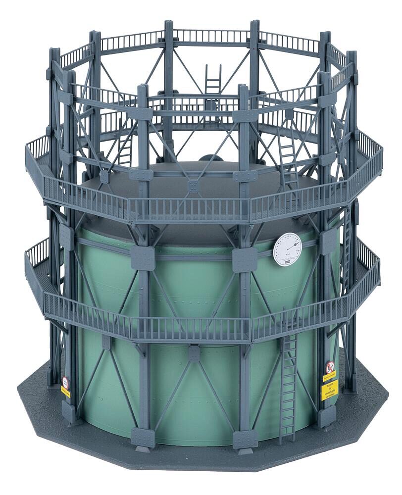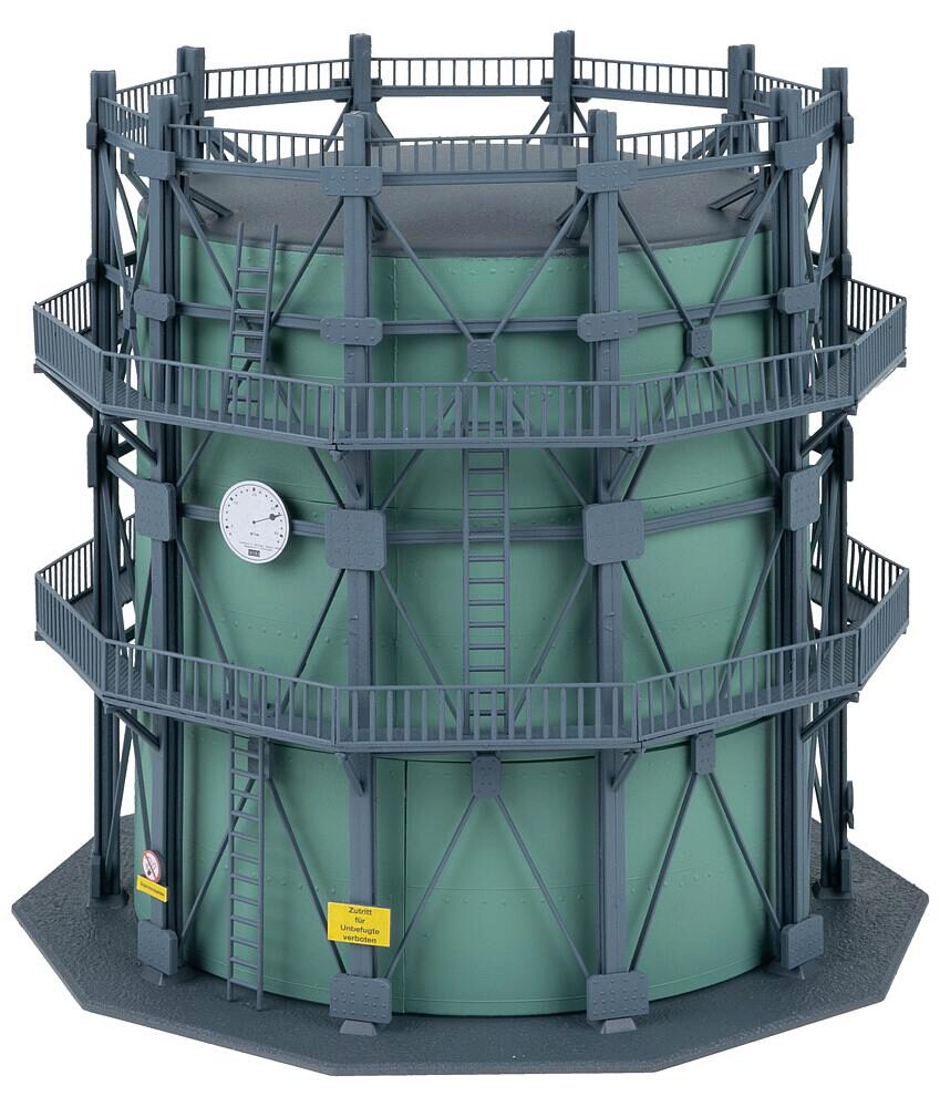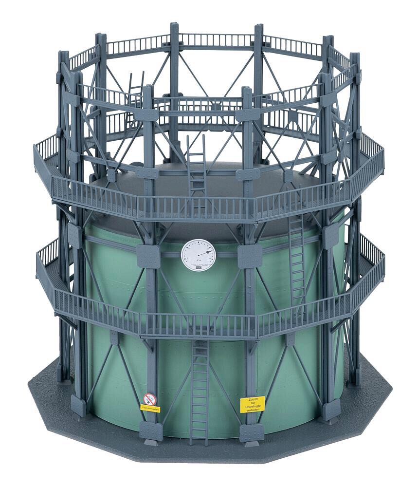 Mit diesem Gasometer samt Rohrleitungen hält die Schwerindustrie Einzug in Ihre Modellbauanlage. Das Modell überzeugt mit einem stabilen Stahlgerüst, Laufstegen und Leitern, die Wartungswege und Zugänge nachbilden. Ein großes Druckmessinstrument sowie Warn- und Hinweisschilder verleihen dem Gasometer zusätzlichen Realismus und unterstreichen seinen industriellen Charakter. Das detailgetreue Modell lässt sich perfekt mit den neuen Rohrleitungs-Sets (Art. 180327 und Art. 180328) kombinieren und kann in zwei unterschiedlichen Höhen aufgebaut werden.