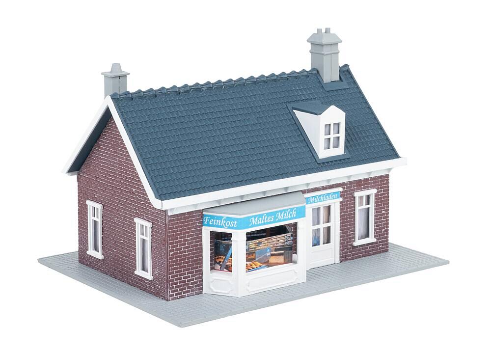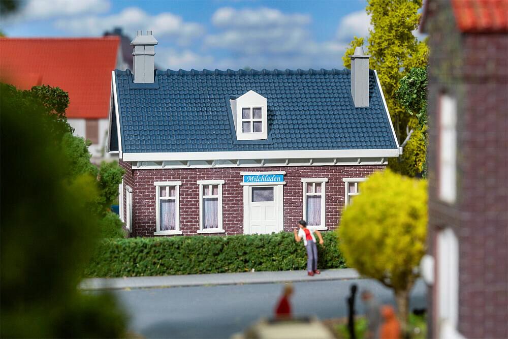 Der kleine Milchladen aus rotem Ziegelstein mit seinen weißen Fenstern strahlt einen charmanten Dorfzauber aus. Man kann sich fast vorstellen, wie die Miniaturbewohner morgens frische Milch kaufen und ein geschäftiges Treiben vor dem Laden entsteht. Dieser liebevoll gestaltete Laden verleiht dem Diorama einen Hauch von ländlichem Leben und nostalgischem Flair.
