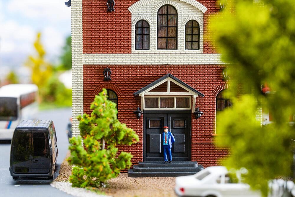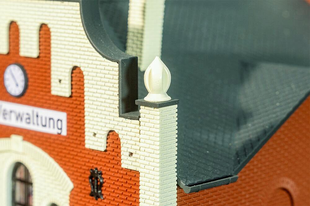 Das Modell im typischen Fabrikstil mit rotem Ziegelstein und weißen Fenstern bereichert jede Modellbahnanlage. Als DB-Verwaltungsgebäude macht es sich besonders in größeren Bahnhofsszenarien und verleiht dem Miniatur-Bahnbetrieb etwas Authentizität.