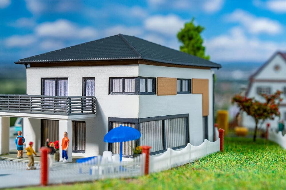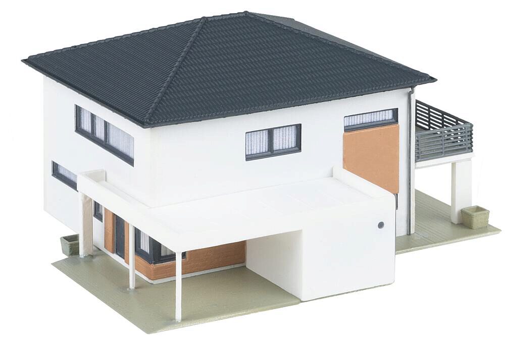 Modernes Stadtleben gefällig? Dieses Modell bringt frischen Wind in jede Vorstadt und verschönert die Modellbauanlage auf stilvolle Weise. Mit seinen weißen Wänden, dem Dach aus schwarzen Ziegeln, dem großzügigen Balkon sowie den eleganten Holzverzierungen und großen Fenstern im Erdgeschoss ist es ein echter Blickfang für Liebhaber zeitgenössischer Architektur.