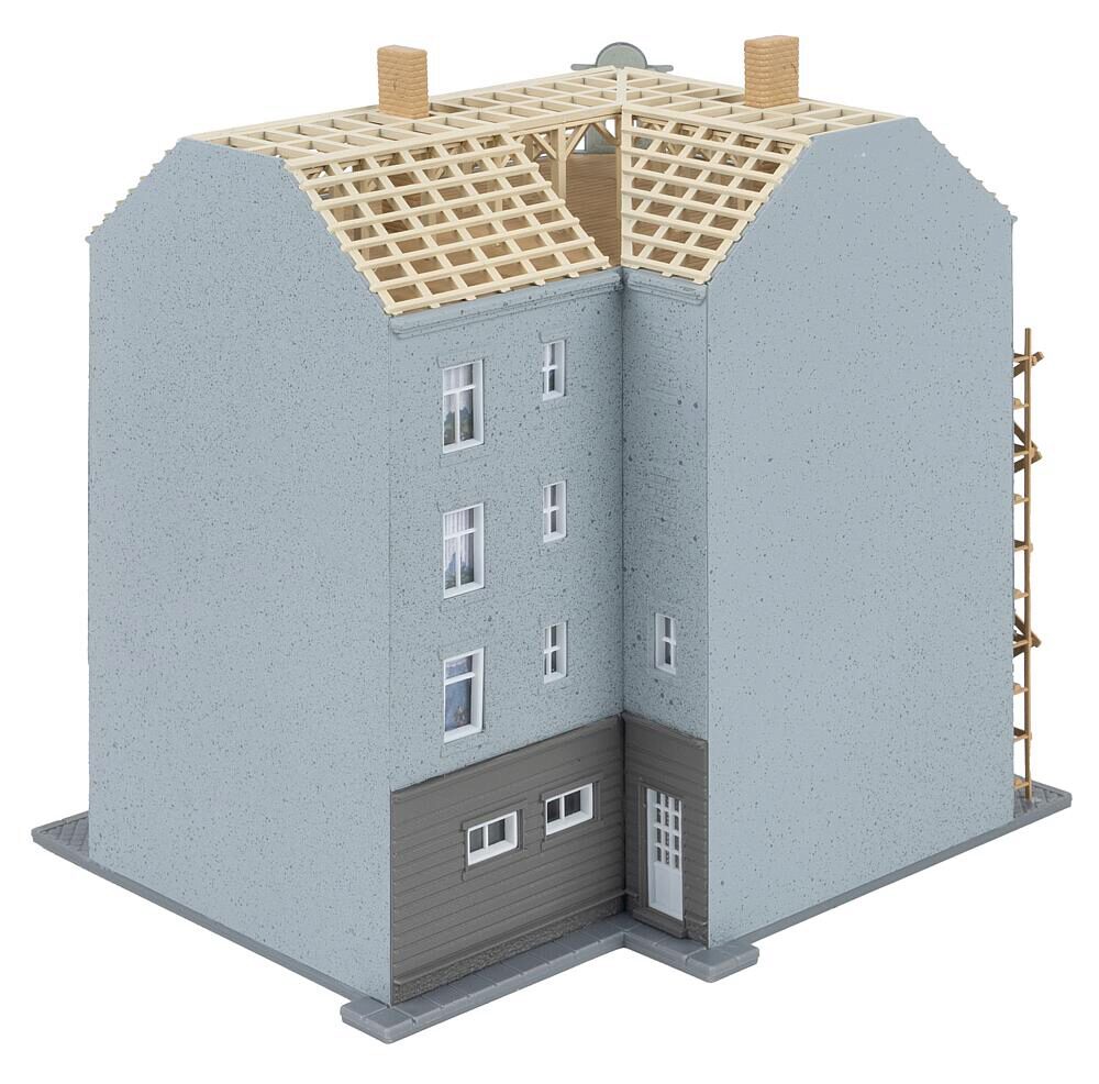 Dieses Stadteckhaus im Umbau verleiht jeder Innenstadt etwas Leben! Im Untergeschoss befindet sich ein Bistro, das Dach und die Fassade befinden sich im Umbau. Auch in der Miniaturwelt muss manchmal renoviert werden.