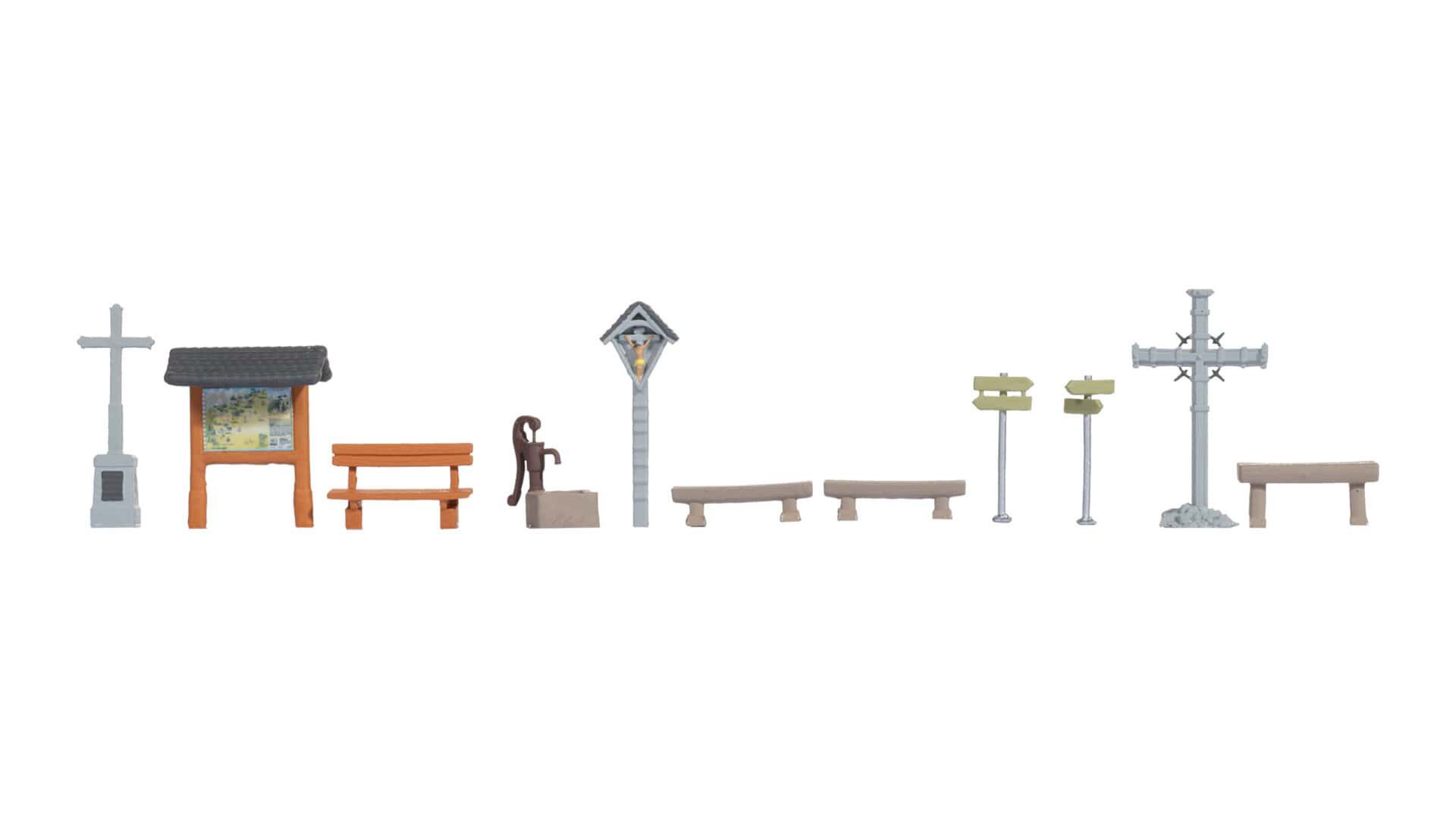 Mit dem Berg-Zubehör von NOCH bringen Sie den Charme der Berge auf Ihre Modellbahnanlage! Dieses Set umfasst liebevoll gestaltete Accessoires wie Wegweiser, Ruhebänke, einen Brunnen, Kreuze und Hinweisschilder. Ideal für die Gestaltung von Wanderwegen, Gipfelbereichen oder Bergdörfern – dieses Zubehör sorgt für realistische Details und lädt Ihre Betrachter in die alpine Welt ein. Ob in einer idyllischen Szene oder als Highlight einer Wanderroute, das Berg-Zubehör ist vielseitig einsetzbar.