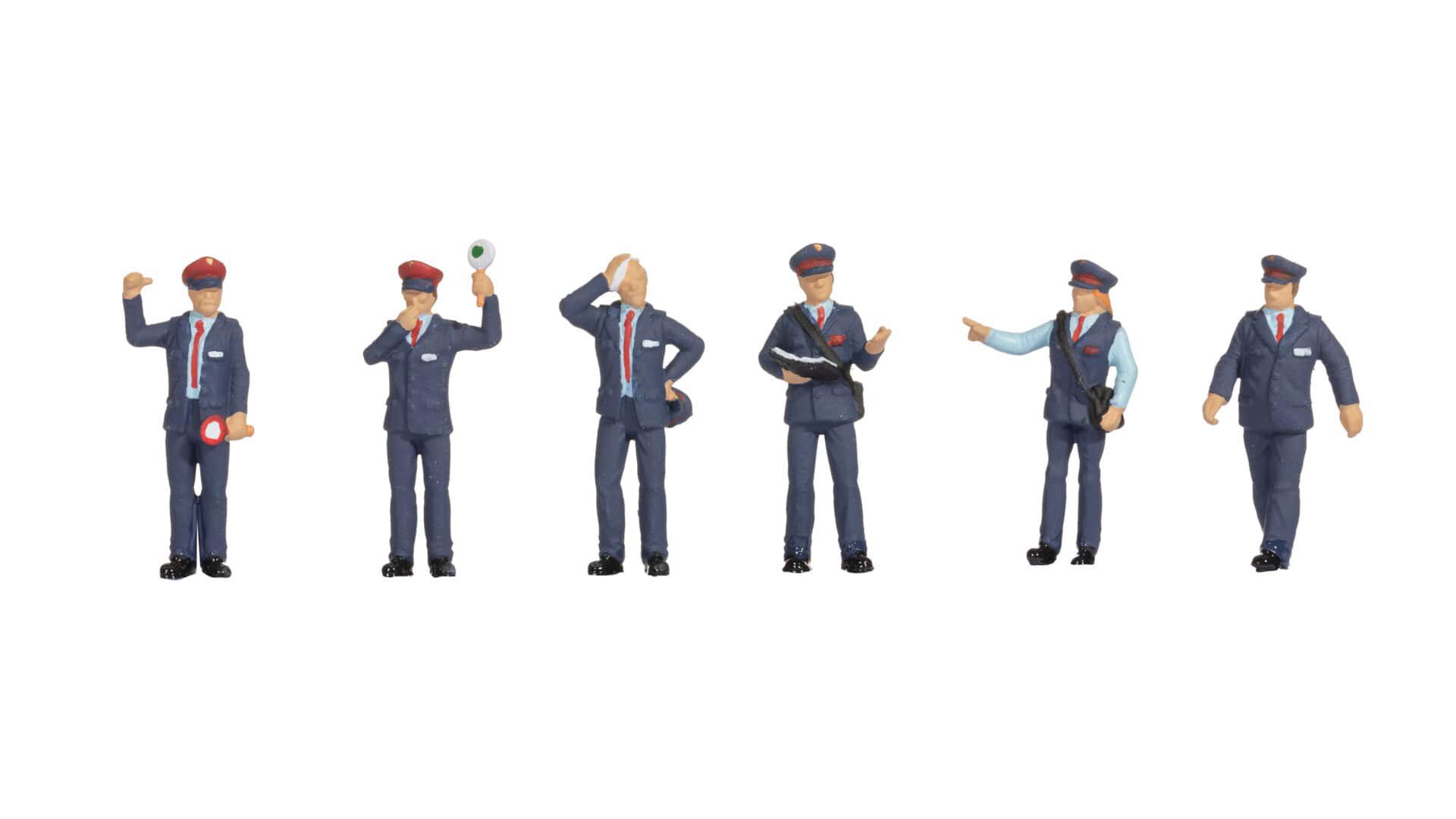 Mit dem Figuren-Set Bahnbeamte Deutschland von NOCH holen Sie den klassischen deutschen Bahnhofsalltag auf Ihre Modellbahnanlage. Dieses Set umfasst sechs detailreiche Figuren in originalgetreuer Uniform. Die Bahnbeamten sind in typischen Posen dargestellt: beim Abfertigen von Zügen, bei der Ticketkontrolle oder bei der Begrüßung von Reisenden.