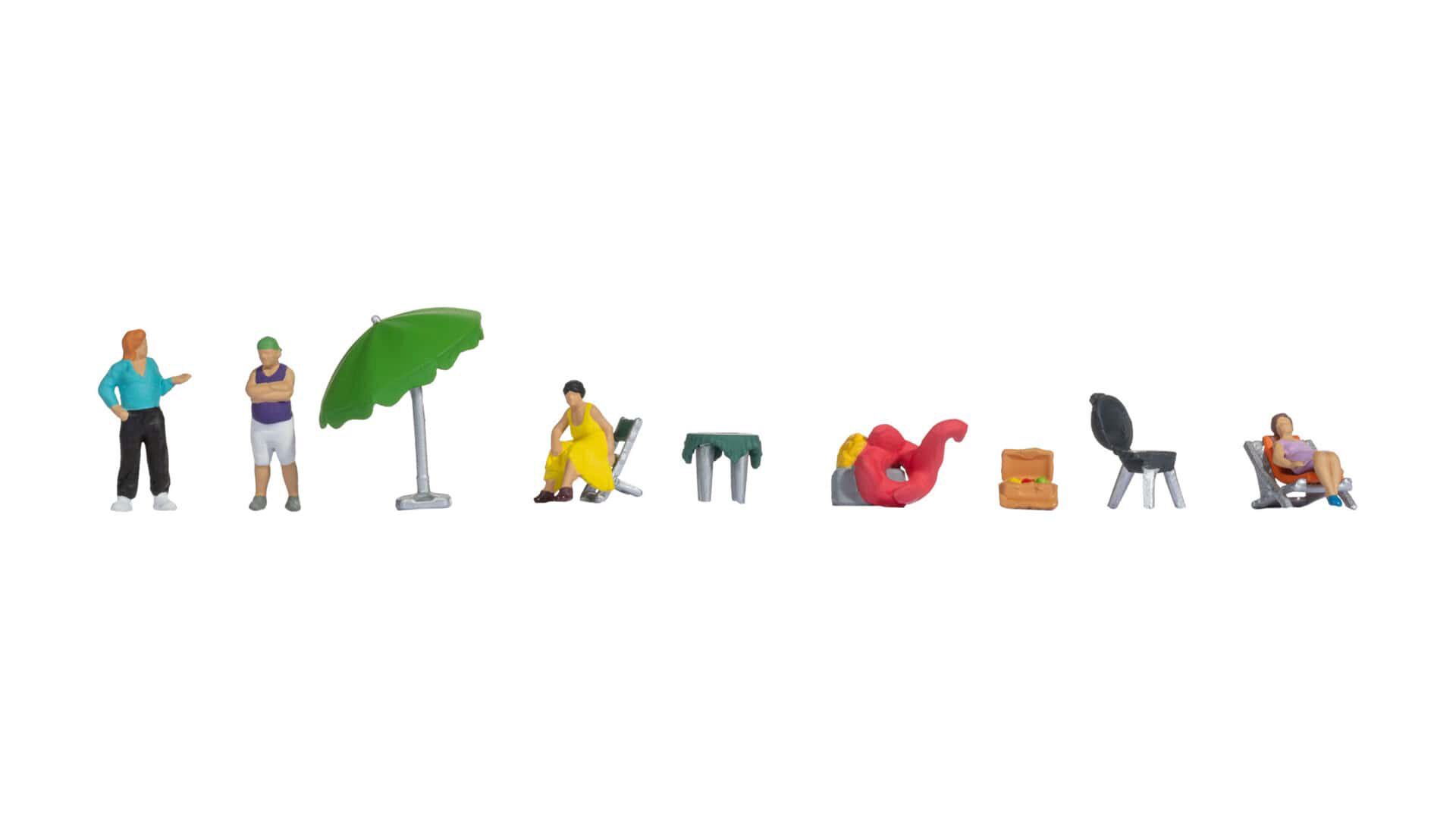 Das Figuren-Set Campingausflug von NOCH bringt sommerliches Urlaubsfeeling auf Ihre Modellbahnanlage. Es umfasst liebevoll gestaltete Figuren, die den Charme eines entspannten Campingurlaubs einfangen: Personen beim Sonnenbaden, Grillen, Entspannen unter einem Sonnenschirm oder mit einem gemütlichen Picknick. Zusätzlich sind typische Campingaccessoires wie ein Grill, ein Klapptisch und eine Sonnenliege enthalten, die diese Szene besonders authentisch machen.