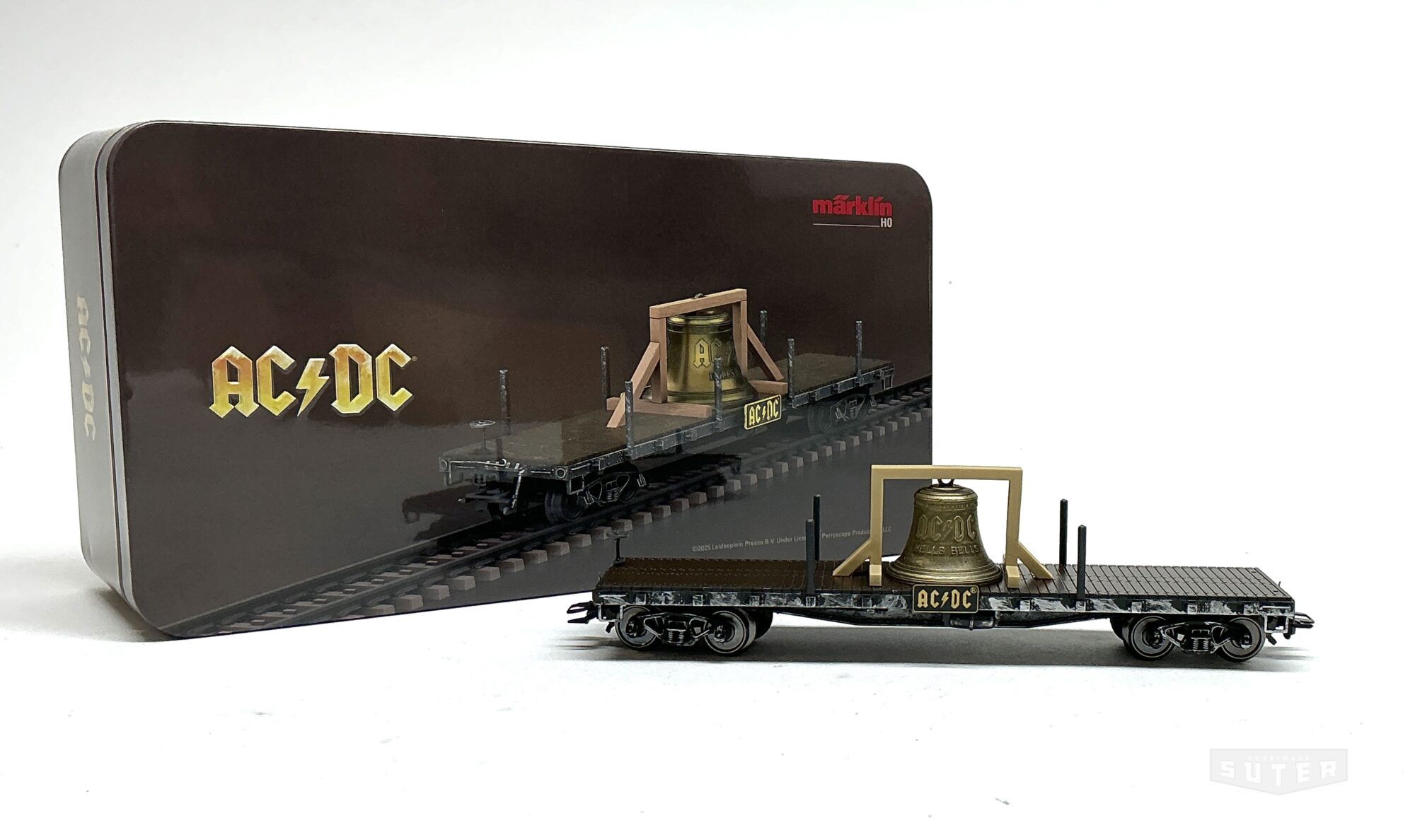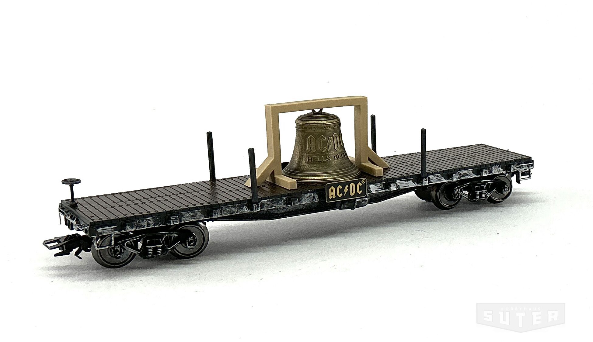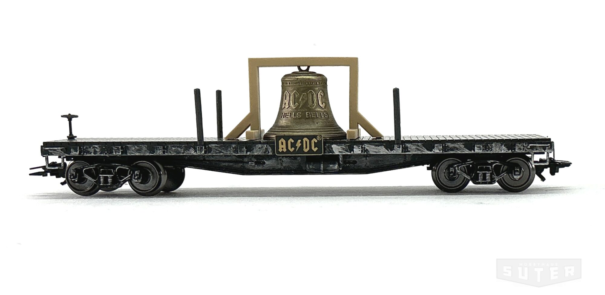 Modell: Flachwagen in Metall-/Kunststoff-Kombination. Wagen-Boden mit separat angesetzten Luftbehältern und Bremsleitungen. Am Wagen-Aufbau Bremsräder und angesetzte Haltegriffstangen. Separat einsteckbare Rungen liegen dem Wagen im Flachbeutel bei. Der Wagen ist mit einer Miniatur der AC/DC Hells Bells-Glocke beladen. Zur Fixierung liegt ein passendes Ladegestell bei. Kulissengeführte Kupplungsdeichseln mit NEM-Normschacht. Länge des Flachwagens ca. 15 cm. Gleichstromradsatz E320552.
