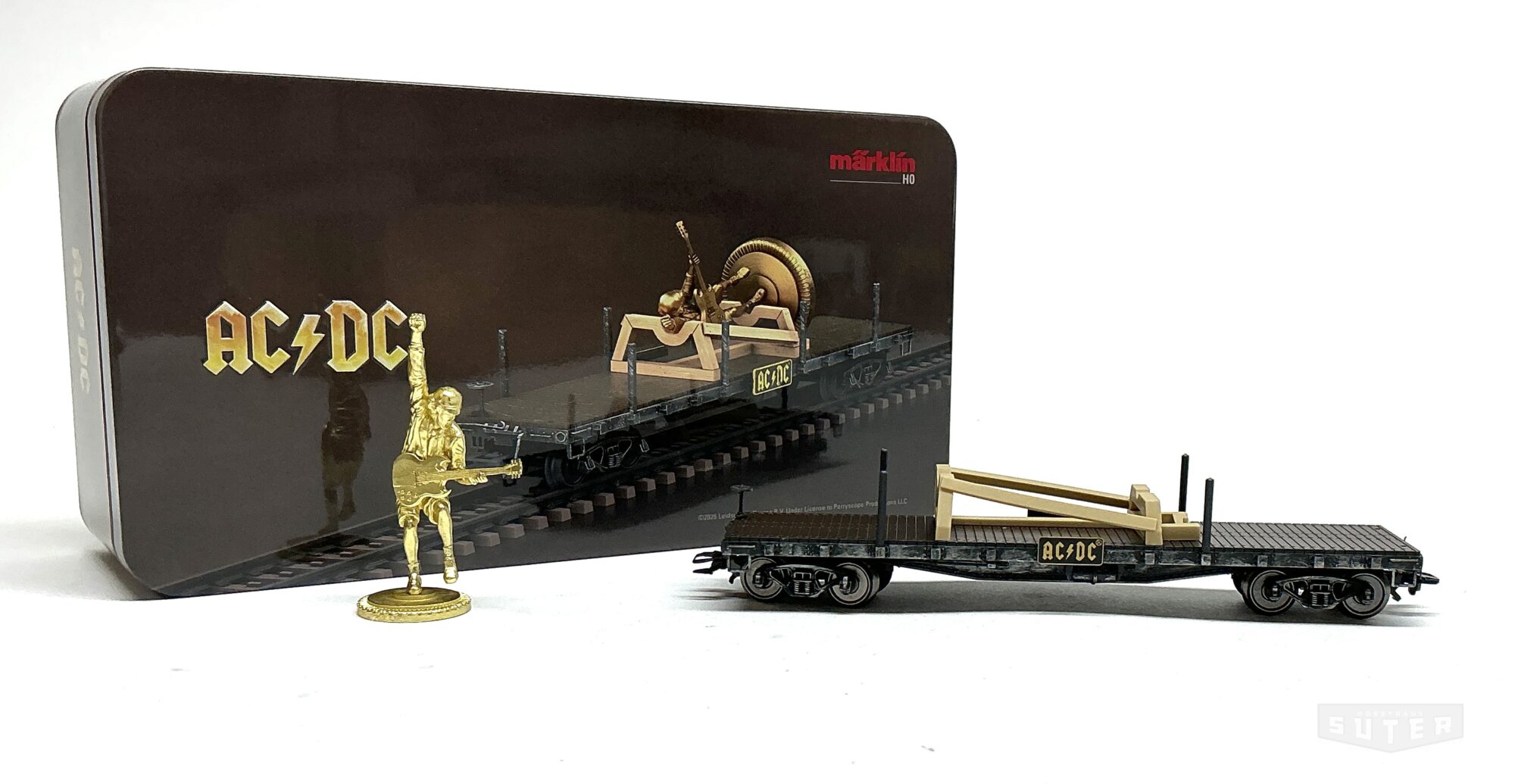 Modell: Flachwagen in Metall-/Kunststoff-Kombination. Wagen-Boden mit separat angesetzten Luftbehältern und Bremsleitungen. Am Wagen-Aufbau Bremsräder und angesetzte Haltegriffstangen. Separat einsteckbare Rungen liegen dem Wagen im Flachbeutel bei. Der Wagen ist mit einer Statue beladen. Zur Fixierung liegt ein passendes Ladegestell bei. Kulissengeführte Kupplungsdeichseln mit NEM-Normschacht. Länge des Flachwagens ca. 15 cm. Gleichstromradsatz E320552.