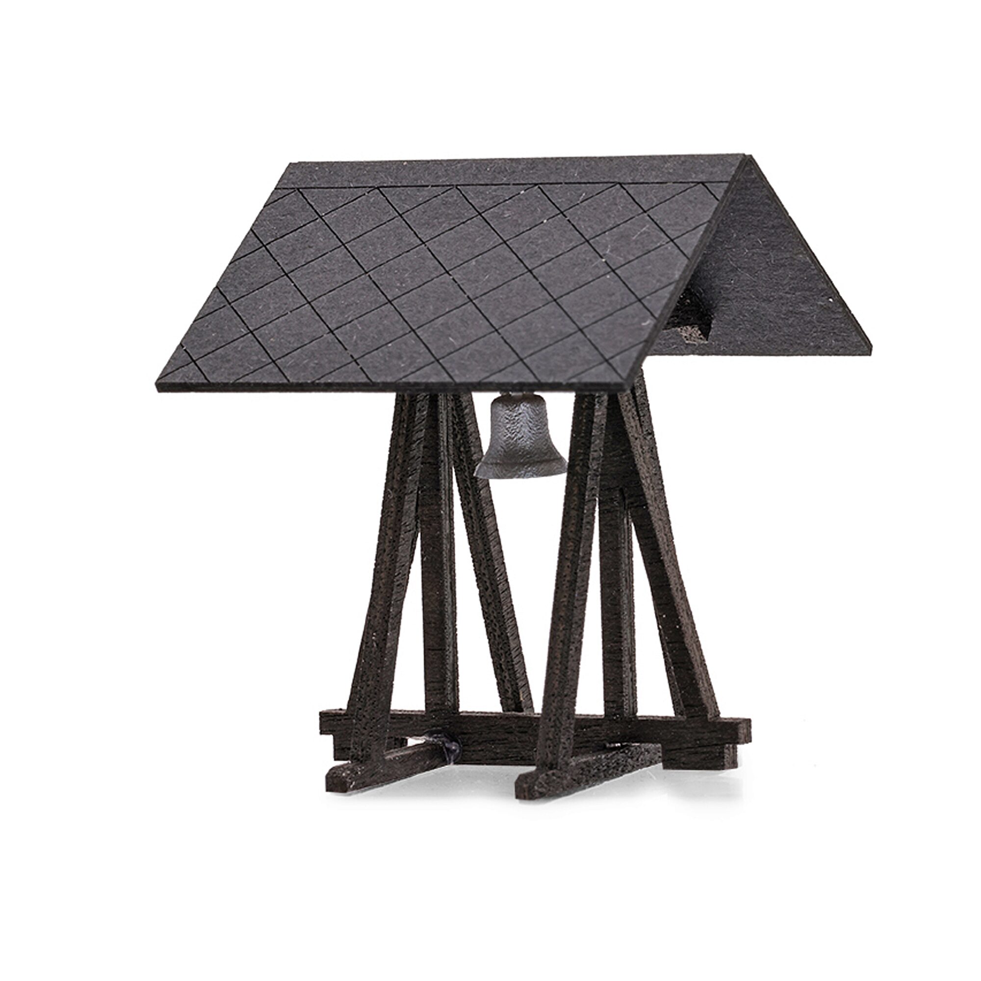 Bausatz aus echtem Holz für einen freistehenden Glockenstuhl mit Glocke. Das Originalvorbild steht am Eingang der Gedenkstätte Kapelle Peenemünde auf der Insel Usedom.