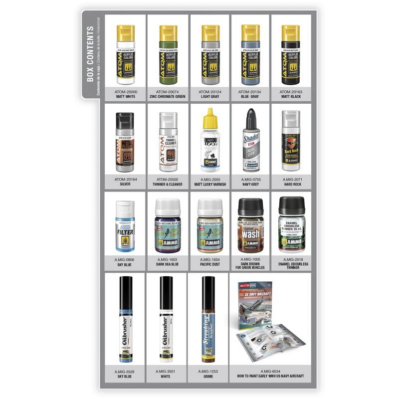 In dieser SOLUTION BOX finden Sie nicht nur die notwendigen Farben, Lacke und Alterungsprodukte zum Bemalen von Flugzeugen der US Navy mit Tarnmustern aus dem frühen Zweiten Weltkrieg, darunter die legendären Flugzeuge F4U Corsair, F4F Wildcat, TBD-1 Devastator, TBF/TBM Avenger, SBD Dauntless und viele mehr. Sie enthält auch das wertvolle Lösungsbuch: So bemalen Sie Flugzeuge der US Navy aus dem frühen Zweiten Weltkrieg. Diese einfache 67-seitige Anleitung enthält erklärende Texte in vier Sprachen (Englisch, Spanisch, Französisch und Deutsch). Das in diesem Lösungsbuch verwendete Modell ist die Douglas TBD-1 Devastator im Maßstab 1:48 von GWH.